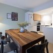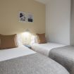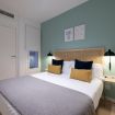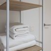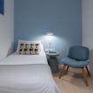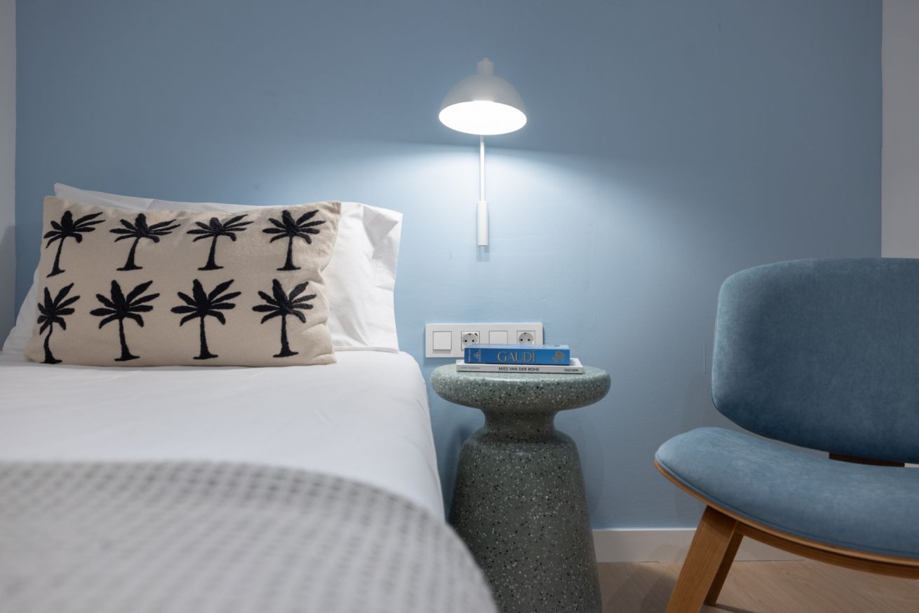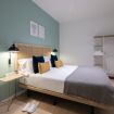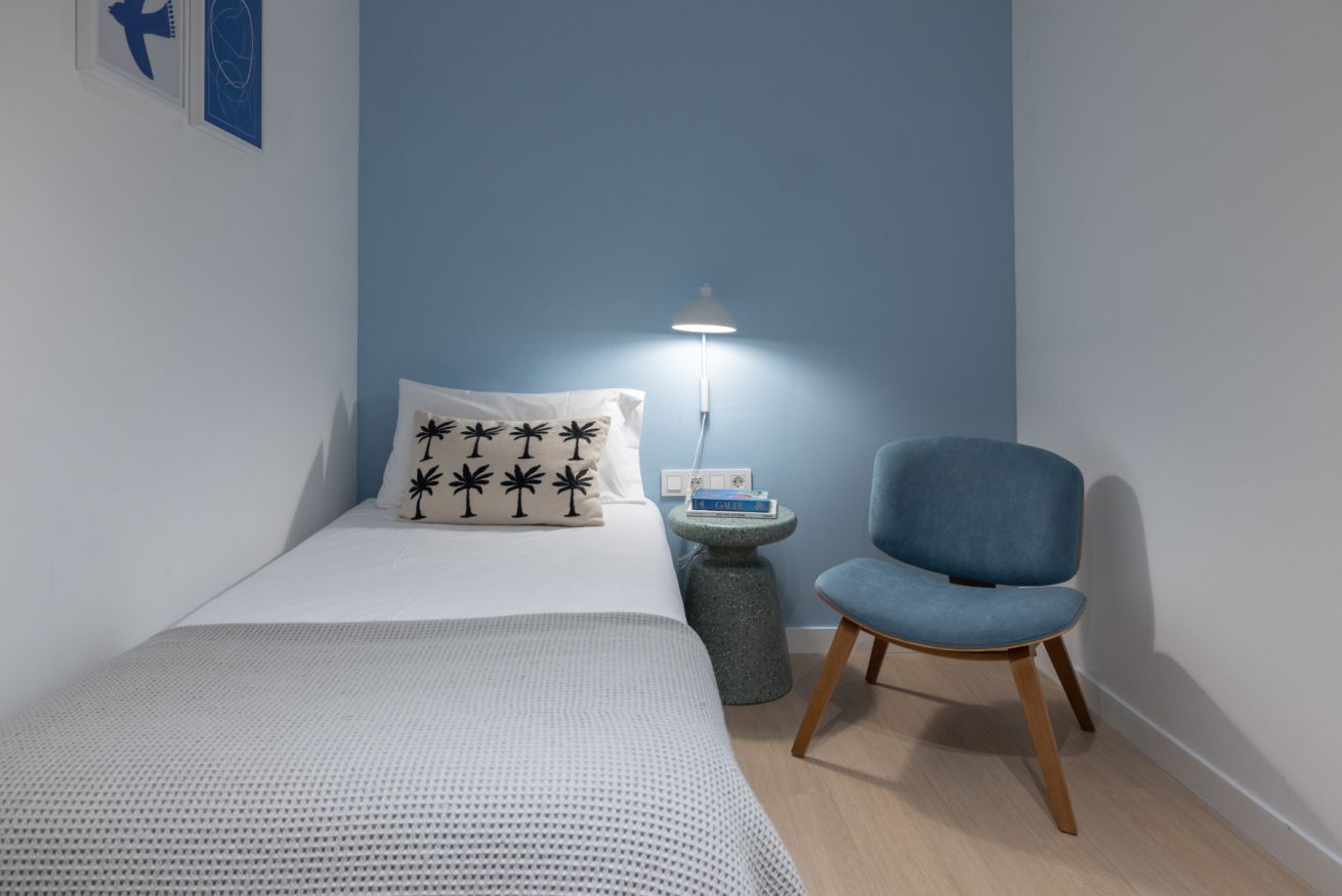 Cuenta con tres habitaciones, La habitación principal dispone de una cama doble, y paredes verdes suaves que generan una atmósfera relajante. Las otras dos habitaciones están equipadas con camas individuales, destacándose por sus paredes en tonos mostaza y textiles en colores cálidos. Una de las habitaciones tiene dos camas individuales separadas, mientras que la tercera presenta una sola cama, ideal para ofrecer flexibilidad según el número de huéspedes. Todas las habitaciones disponen de espacios de almacenamiento abiertos y prácticos, ideales para estancias tanto cortas como prolongadas.