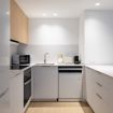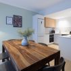La cocina está equipada con electrodomésticos esenciales y utensilios, junto al área del comedor.
