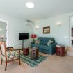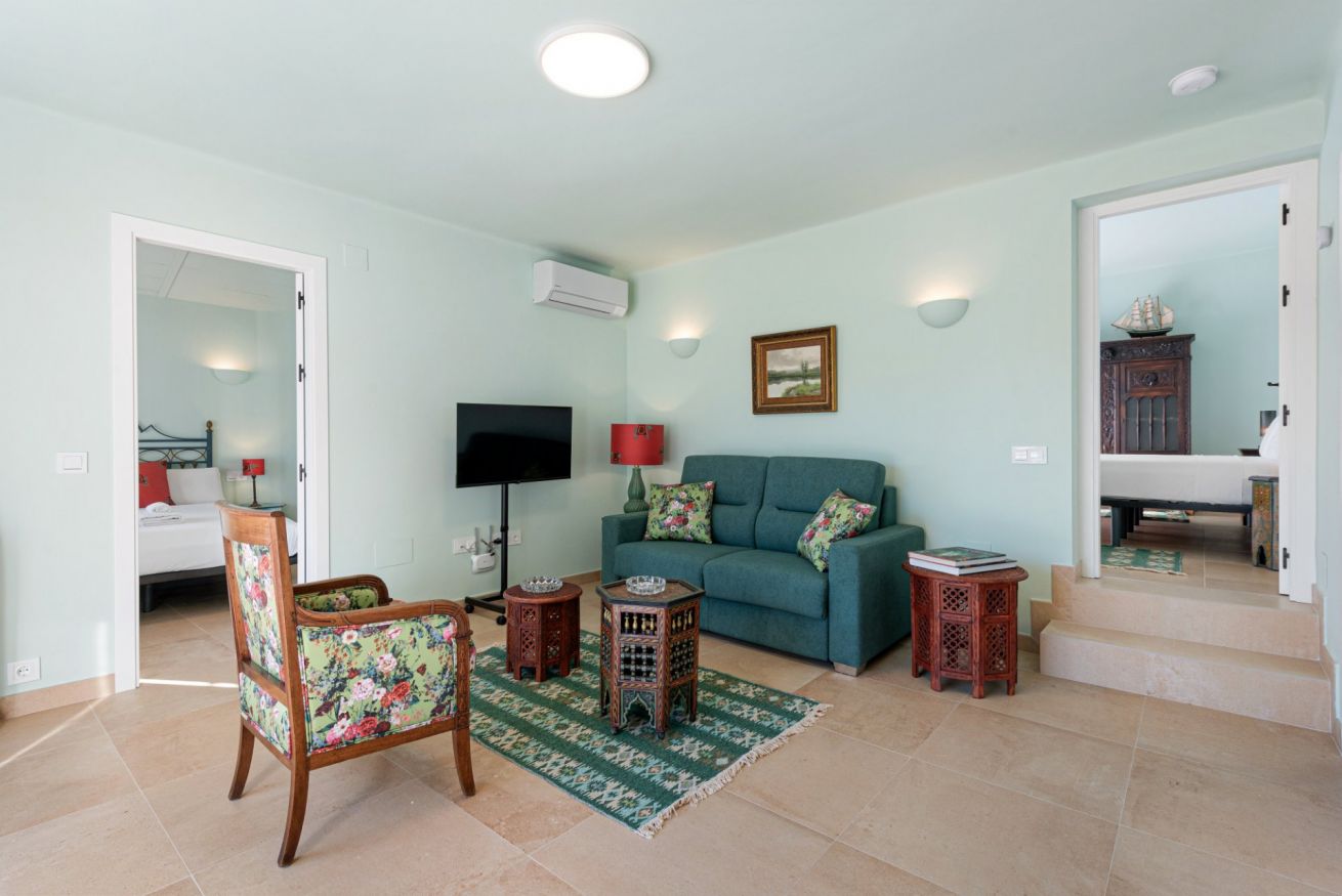 El salón principal es un espacio ideal para compartir momentos en familia o con amigos. Está amueblado con un cómodo sofá, una televisión de pantalla plana y detalles decorativos que aportan un aire auténtico y elegante. Desde aquí, se accede a una terraza privada donde podrás disfrutar del aire fresco y la calma del entorno.