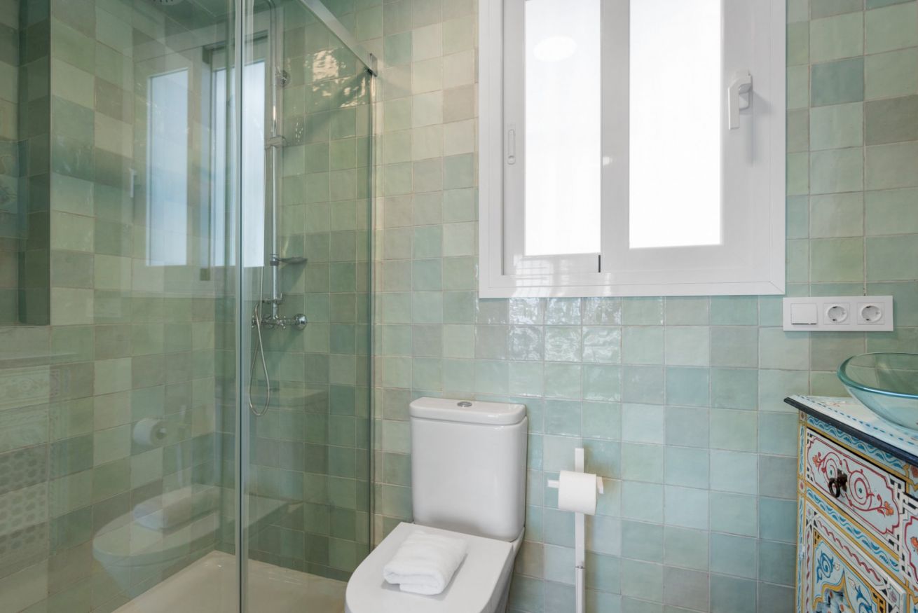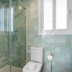 Los baños están diseñados con azulejos de tonos verdes y elementos artesanales, creando un ambiente de spa. Disponen de una moderna ducha con mampara de cristal, lavabo de vidrio y todos los elementos esenciales para tu comodidad, como toallas y amenities de cortesía.