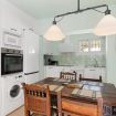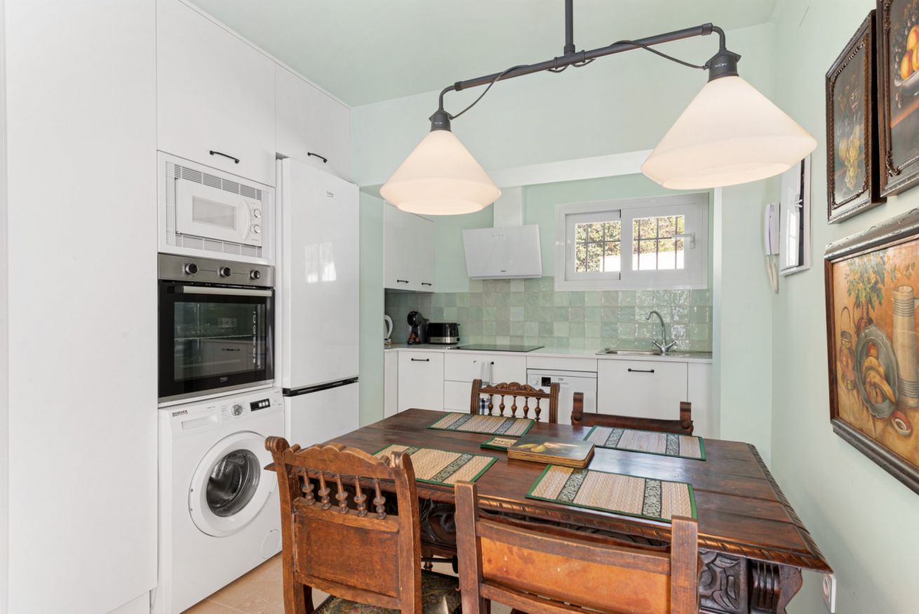 La cocina completamente equipada dispone de electrodomésticos modernos, incluyendo horno, microondas, lavavajillas y cafetera, además de una mesa de comedor de madera que aporta un toque rústico y encantador al espacio.