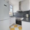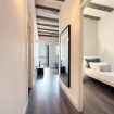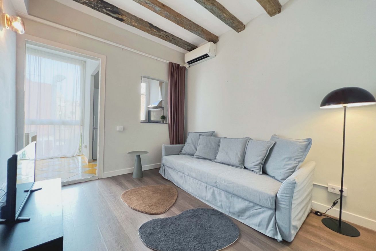 El pequeño salón está ubicado en el centro del apartamento, lo que facilita moverse por el espacio. El apartamento tiene hermosos pisos de madera, techos abiertos y una decoración discreta y de buen gusto.