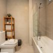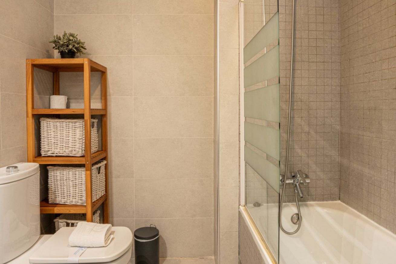 La única habitación de la vivienda cuenta con una cómoda cama doble y un amplio armario para organizar tus pertenencias. Desde este espacio, se accede a un baño completo con bañera, toallas y artículos básicos de aseo para tu comodidad.