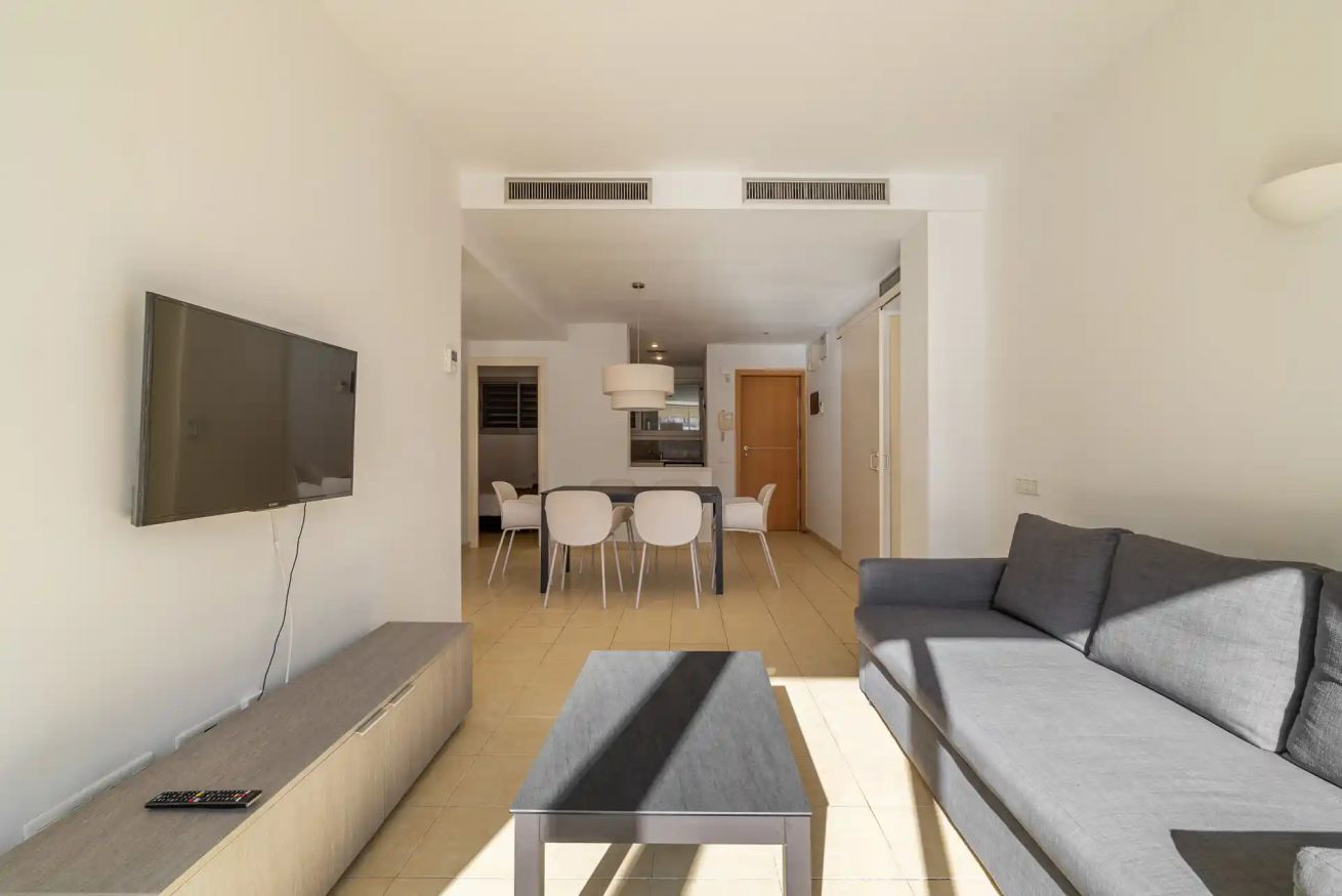 El apartamento también incluye una sala de estar con un cómodo sofá, el lugar perfecto para conversar y relajarse, o ver la TV.