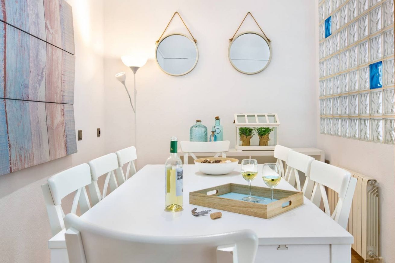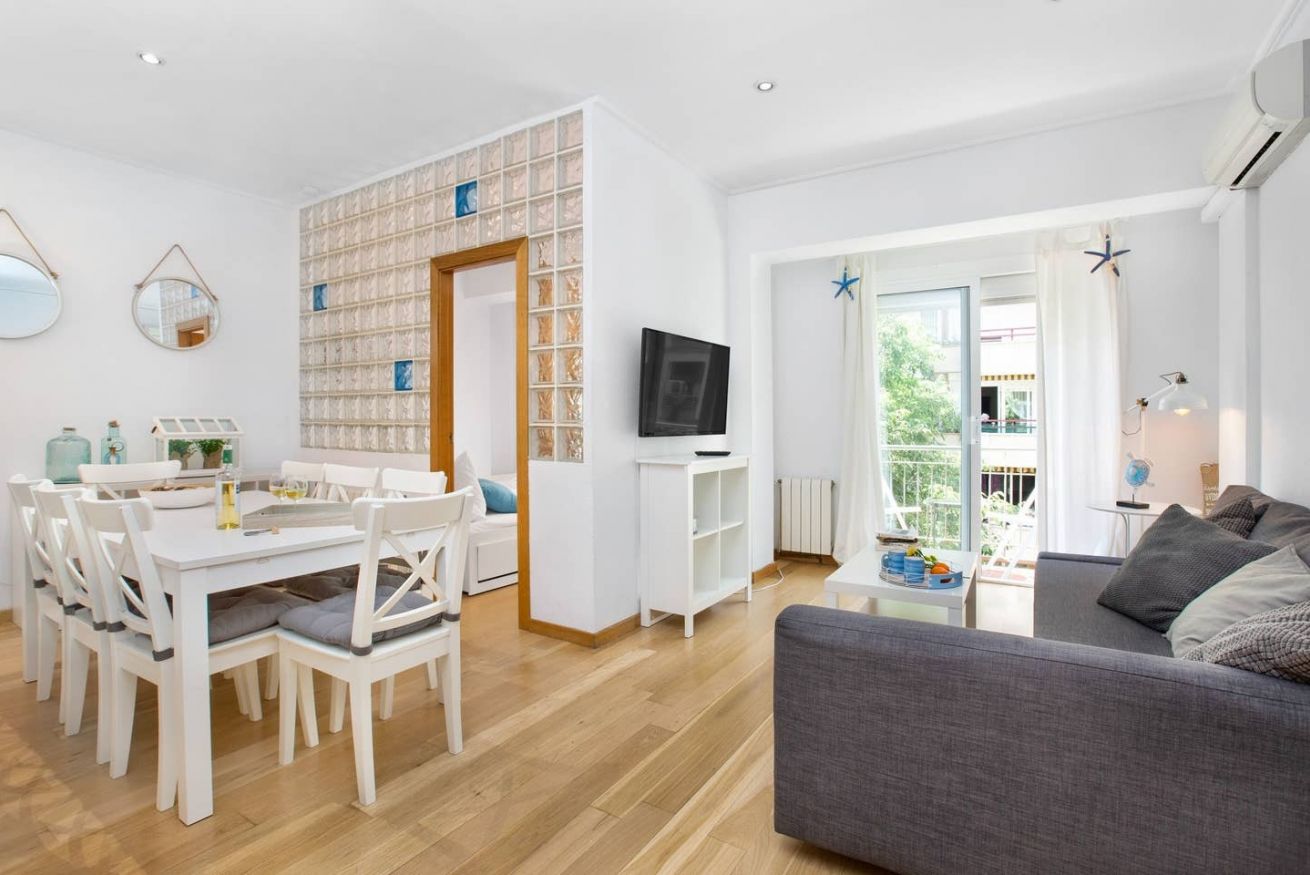 El salón-comedor de este apartamento en Barcelona es un espacio acogedor y luminoso, gracias a su proximidad al balcón que permite una excelente entrada de luz natural. Está equipado con un cómodo sillón ideal para descansar, y cuenta con una televisión para entretenimiento. Además, dispone de conexión WiFi, asegurando que los huéspedes puedan estar conectados en todo momento.