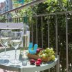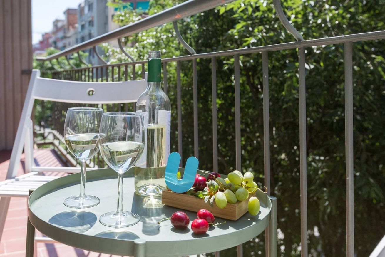 El balcón de este apartamento en Barcelona es su mayor atractivo, ofreciendo un espacio encantador con cómodas sillas desde las cuales se puede disfrutar de una vista perfecta de la ciudad. Este rincón al aire libre invita a relajarse y disfrutar del clima mediterráneo mientras se contempla el paisaje urbano. Es el lugar ideal para disfrutar de desayunos al aire libre con vistas panorámicas o para relajarse con una copa de vino al atardecer, convirtiéndolo en el punto focal del apartamento.