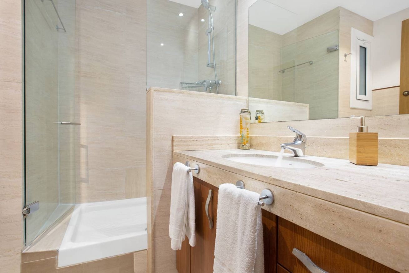 El baño de este apartamento en Barcelona destaca por su encantadora decoración, con azulejos que añaden un toque elegante y luminoso al espacio. Equipado con una ducha moderna y confortable, el baño ofrece un ambiente acogedor y funcional, ideal para relajarse y refrescarse después de un día de exploración por la ciudad.