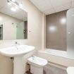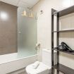 El baño cuenta con ducha, bañera, inodoro, espejo y agua caliente, brindando comodidad y espacio para relajarse después de un largo día.