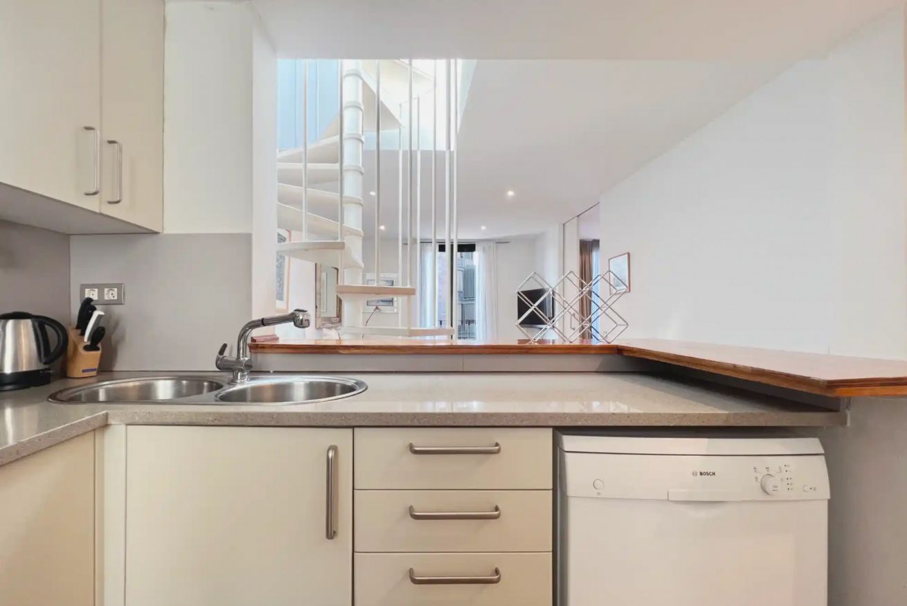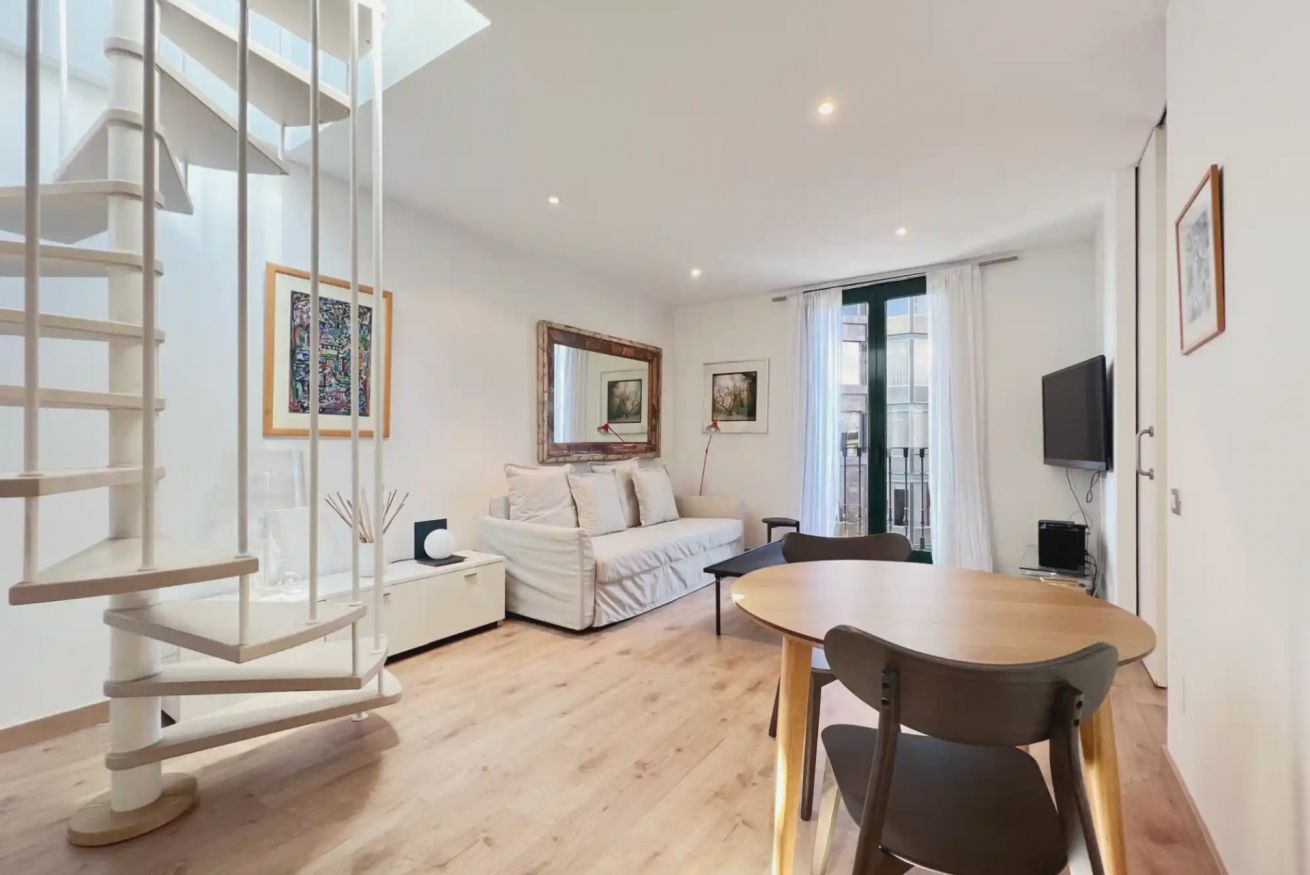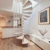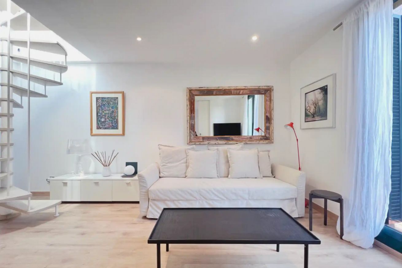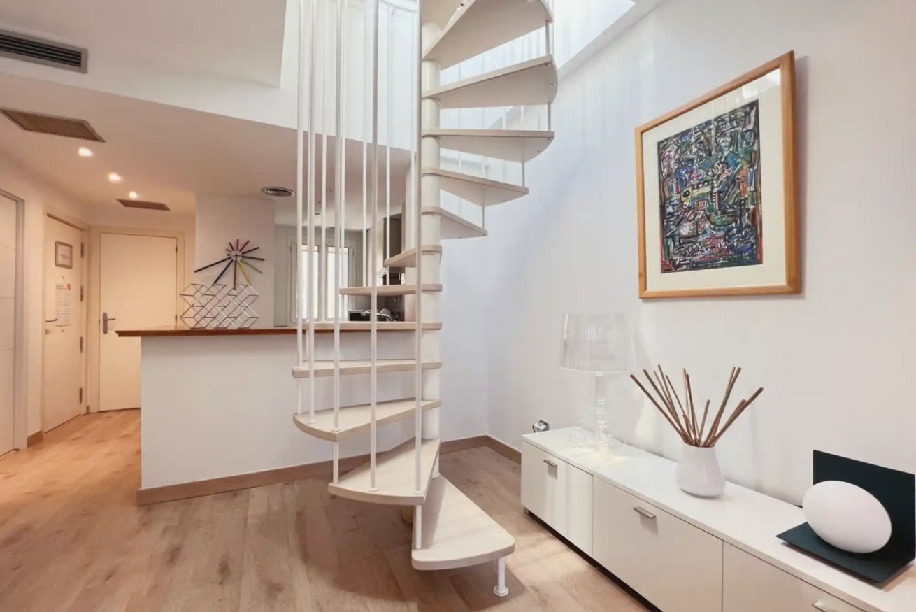La zona de estar se encuentra en el centro del apartamento, por lo que es fácil moverse por el espacio. El apartamento tiene un bonito suelo de madera clara y una decoración discreta de buen gusto. Una escalera de caracol conduce desde el salón a la fantástica terraza de la azotea.