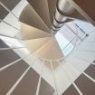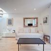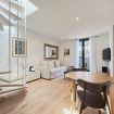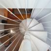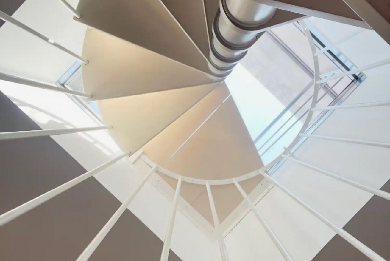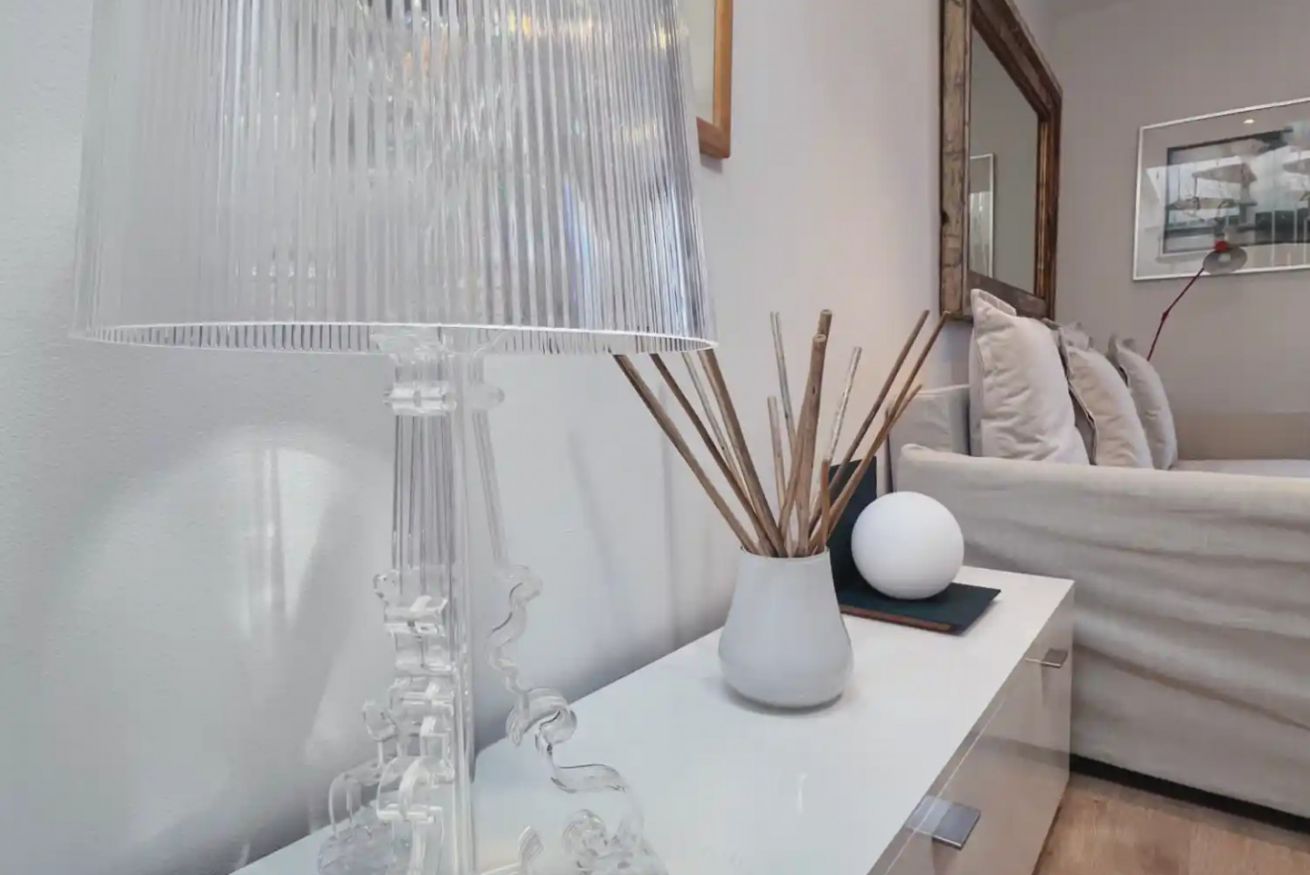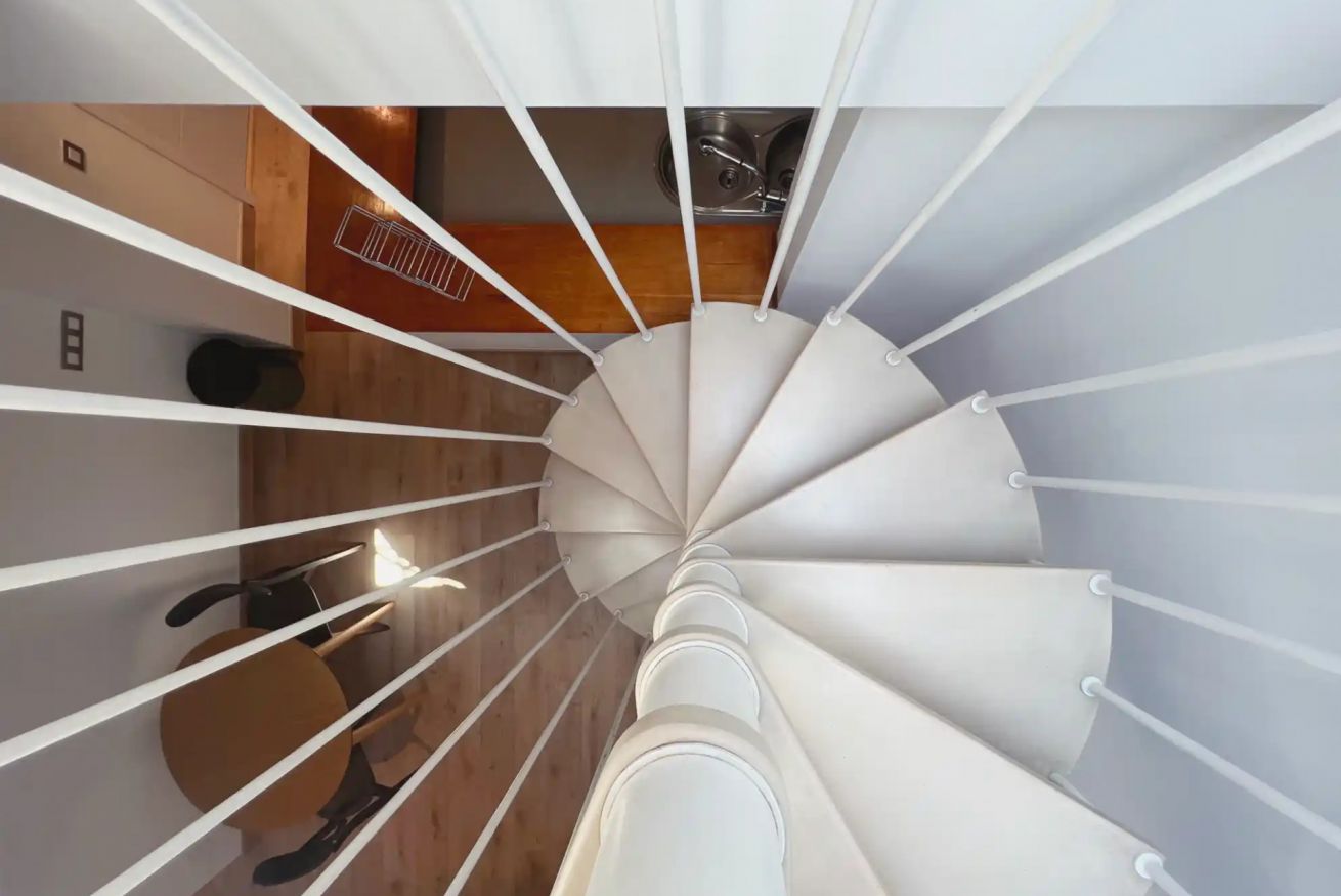 La zona de estar se encuentra en el centro del apartamento, por lo que es fácil moverse por el espacio. El apartamento tiene un bonito suelo de madera clara y una decoración discreta de buen gusto. Una escalera de caracol conduce desde el salón a la fantástica terraza de la azotea.