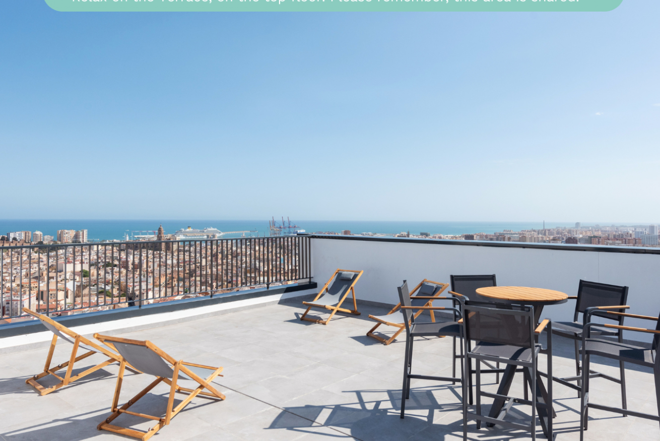 Las comodidades del edificio son de primera clase, incluyendo una piscina compartida en la azotea desde donde se pueden admirar impresionantes vistas de la ciudad de Málaga. También tienes acceso a un gimnasio bien equipado, un parque infantil y una sala de cine.