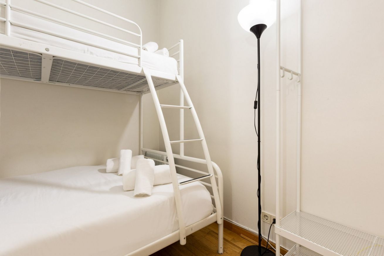 Cuenta con 2 habitaciones. La habitación principal tiene una con cama de matrimonio y un pequeño balcón que aporta mucha luz y aire fresco. La segunda habitación tiene una litera (la cama inferior doble y la superior individual).