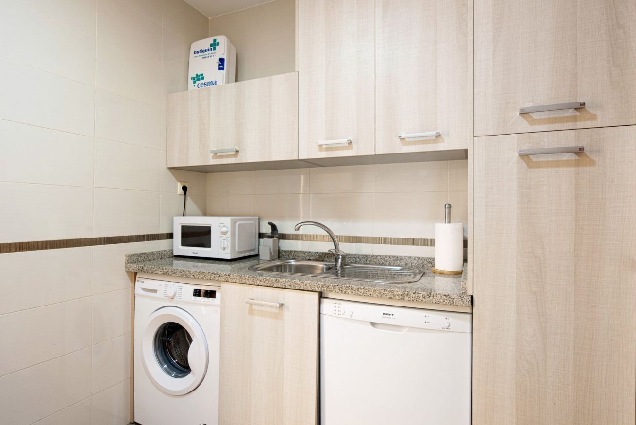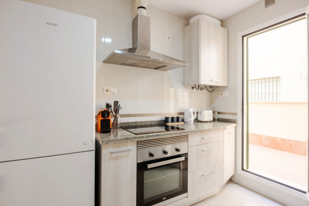 El corazón del apartamento es la cocina totalmente equipada, que cuenta con electrodomésticos modernos, amplio espacio en las encimeras y todos los utensilios de cocina que necesitas para preparar deliciosas comidas. Ya seas un chef experimentado o solo quieras preparar un refrigerio rápido, esta cocina tiene todo lo que necesitas.