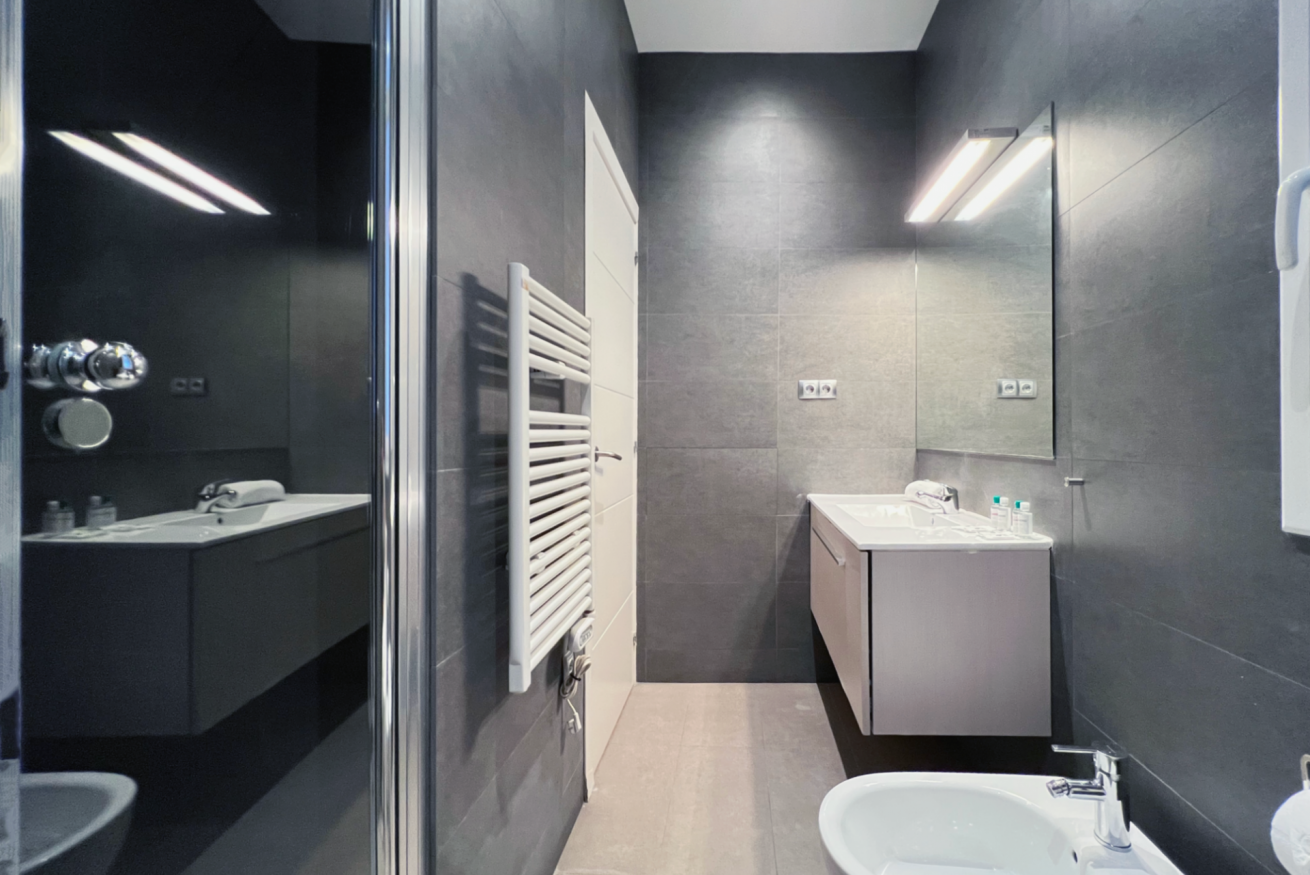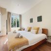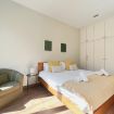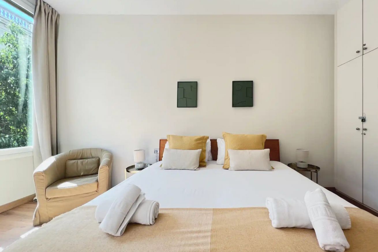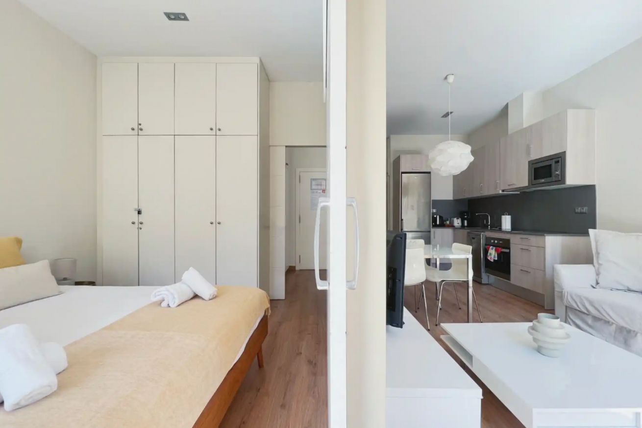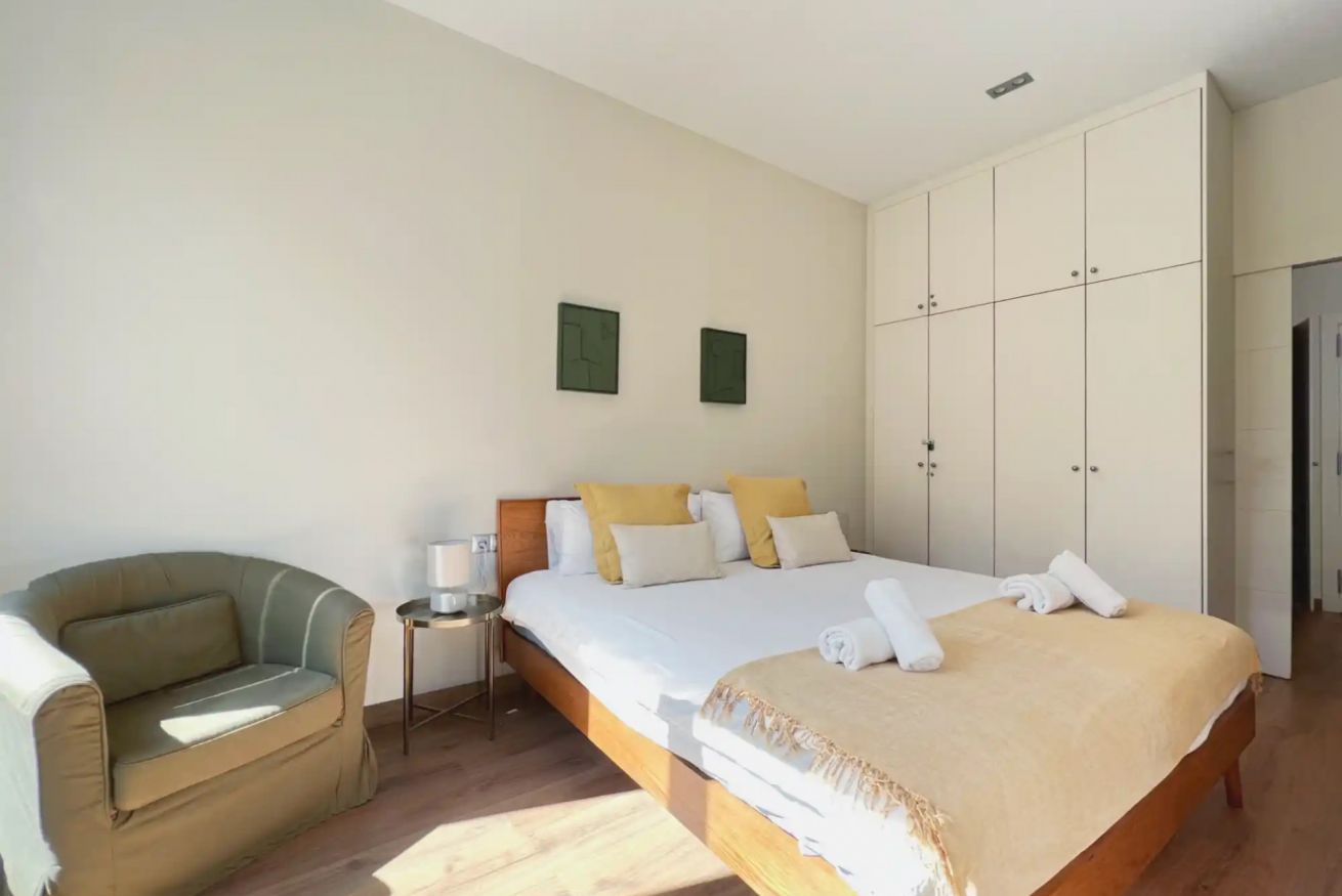 El dormitorio está equipado con una cama doble, ropa de cama y una suave iluminación natural. Las ventanas son grandes y proporcionan a la habitación una impresionante luz natural que asegurará que el día comience de la manera correcta. También hay un sofá cama doble en el salón, ideales para niños o amigos. El dormitorio es cálido y acogedor, y un gran lugar para relajarse después de explorar la hermosa ciudad.