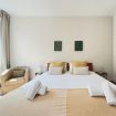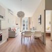 La zona de estar se encuentra en el centro del apartamento, por lo que es fácil moverse por el espacio. El apartamento tiene un bonito suelo y una decoración discreta de buen gusto.