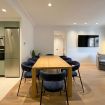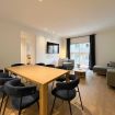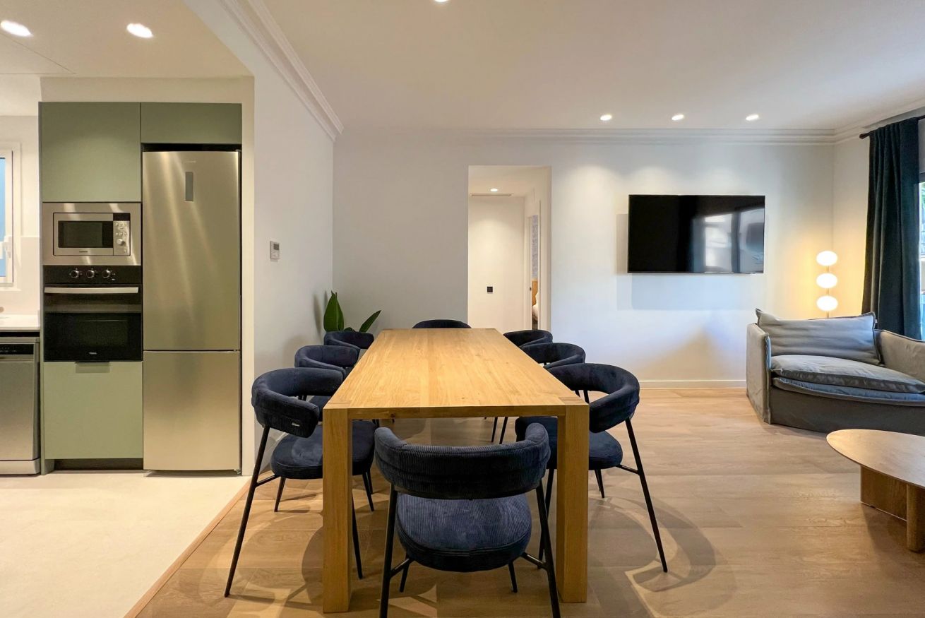 El comedor, conectado al salón, está equipado con una gran mesa y sillas, creando el ambiente perfecto para compartir comidas en grupo.