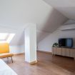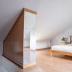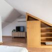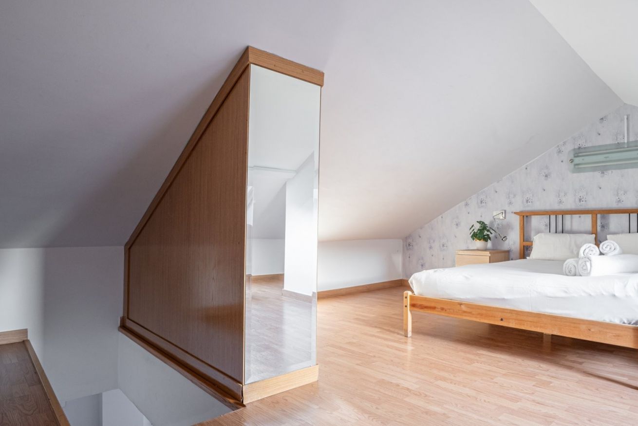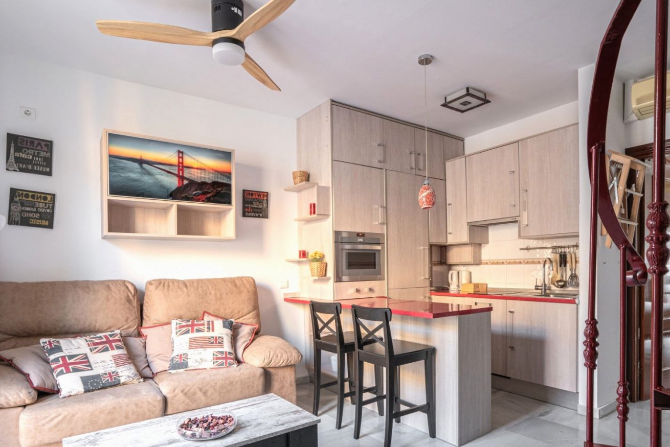 En la cocina - comedor se encuentra una escalera caracol que lleva a la segunda habitación. Las personas altas deben ser precavidas en esta escalera, ya que podrían tocar el techo, al igual que dentro de la habitación. Cuenta con una cama doble, luz natural y espacio para guardar tus cosas.