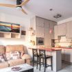 La cocina - comedor es un espacio que cuenta con los electrodomésticos y utensilios que necesitas para preparar tus desayunos y comidas, un desayunador con banquetas, un sillón para descansar, TV, y una ventana que asegura luz natural.