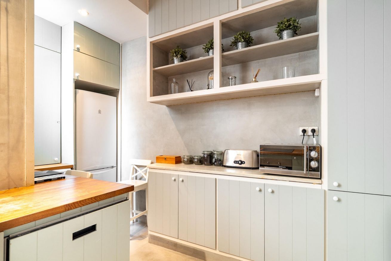 Una cocina con todo lo necesario para cocinar una comida perfecta y una sala de estar con una hermosa mesa para comer y balcones para desayunar.