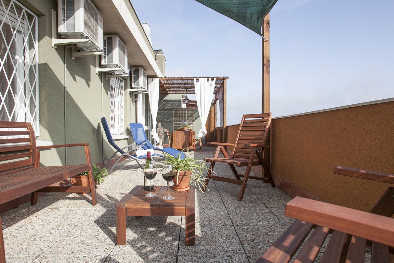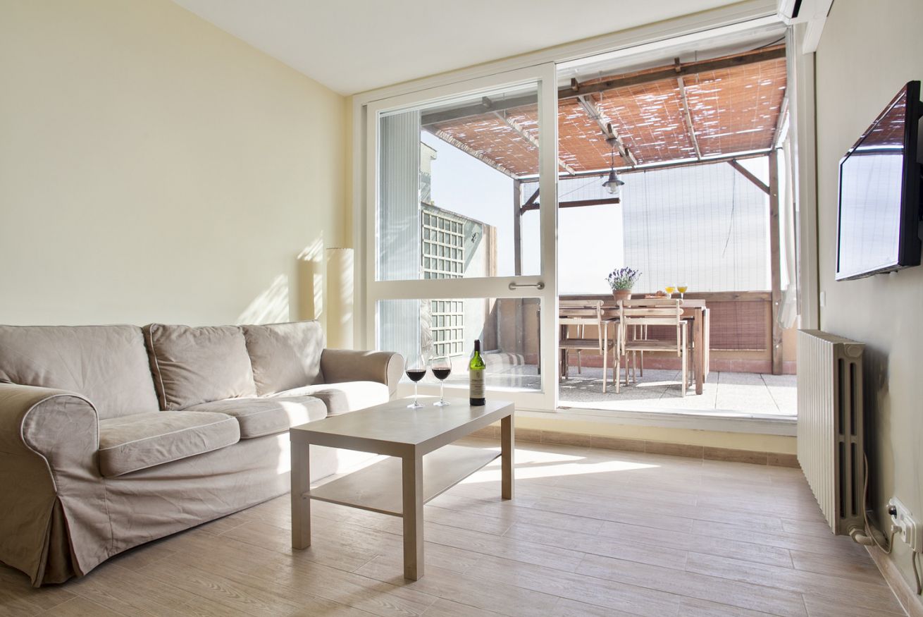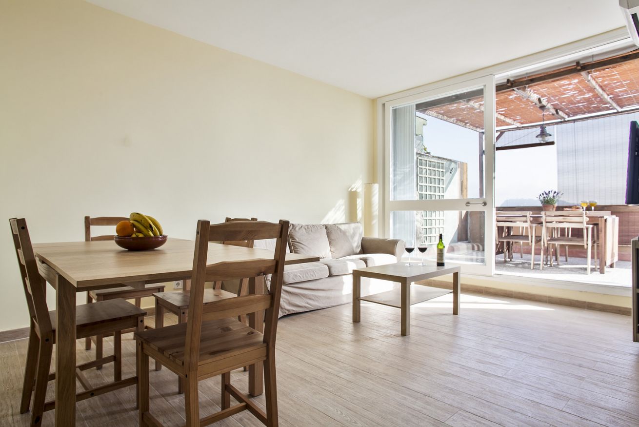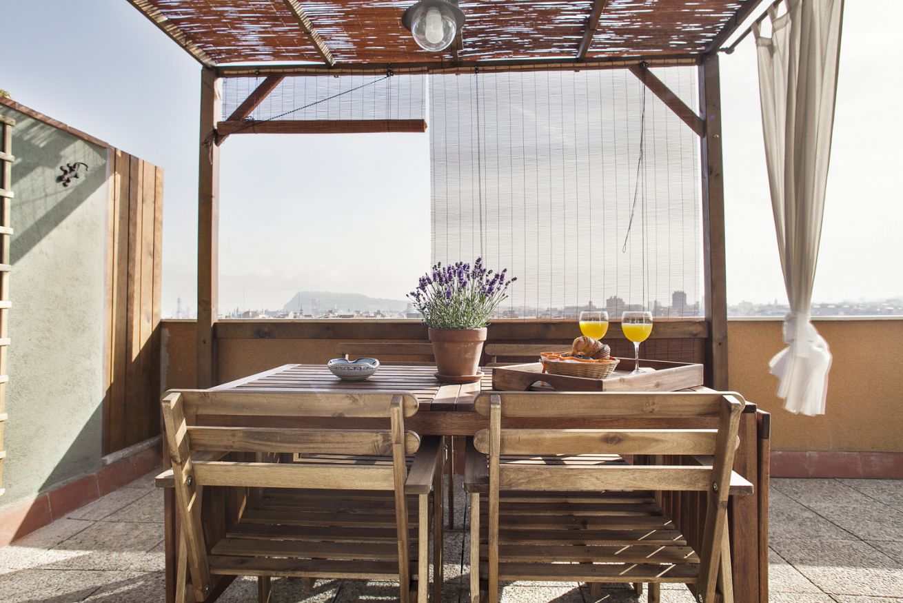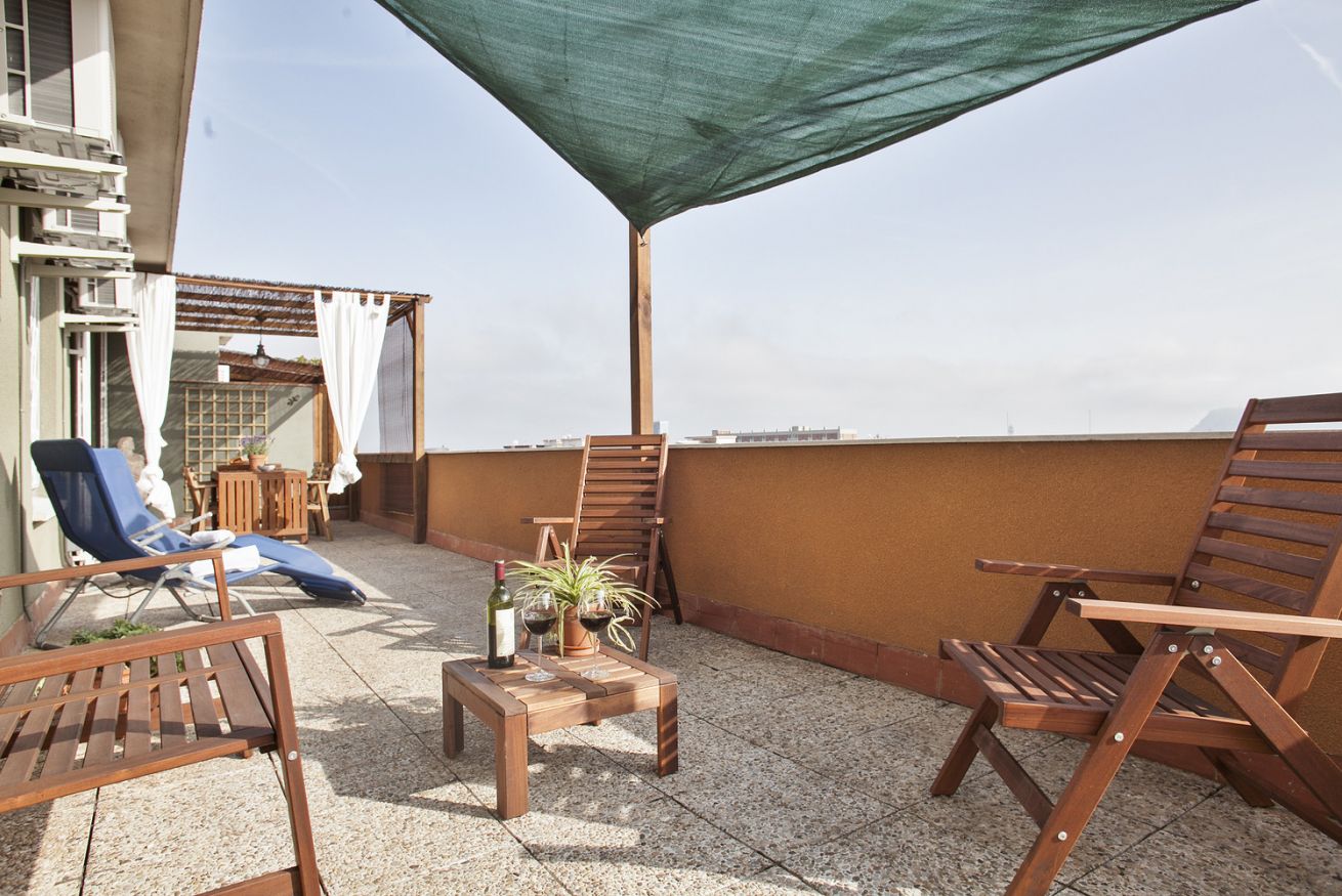 Este soleado apartamento está situado en un 10º piso de la calle Marina va al mar desde la torre (Hotel de les Arts y la Torre Mapfre), y asciende a la Iglesia de la Sagrada Familia. Todas las habitaciones y el comedor, mirar a Barcelona a través de la terraza de 40 m2 con pérgola de madera y zona de relajación. La vista que van desde el puerto Olímpico y las torres, a la cima del Tibidabo. Disfrutar de la silueta a través de la World Trade Center, el antiguo puerto comercial de el teleférico, las chimeneas de las camisas, la Estatua de Colón, la montaña de Montjuic, con su castillo, el estadio Olímpico y el Palacio Nacional. Entonces sus ojos en el centro histórico, y podrá ver la Catedral y de las cúpulas y las torres de la Plaza Cataluña y Paseo de Gracia. En la final, su derecho hasta la cerca de la Sagrada Familia.