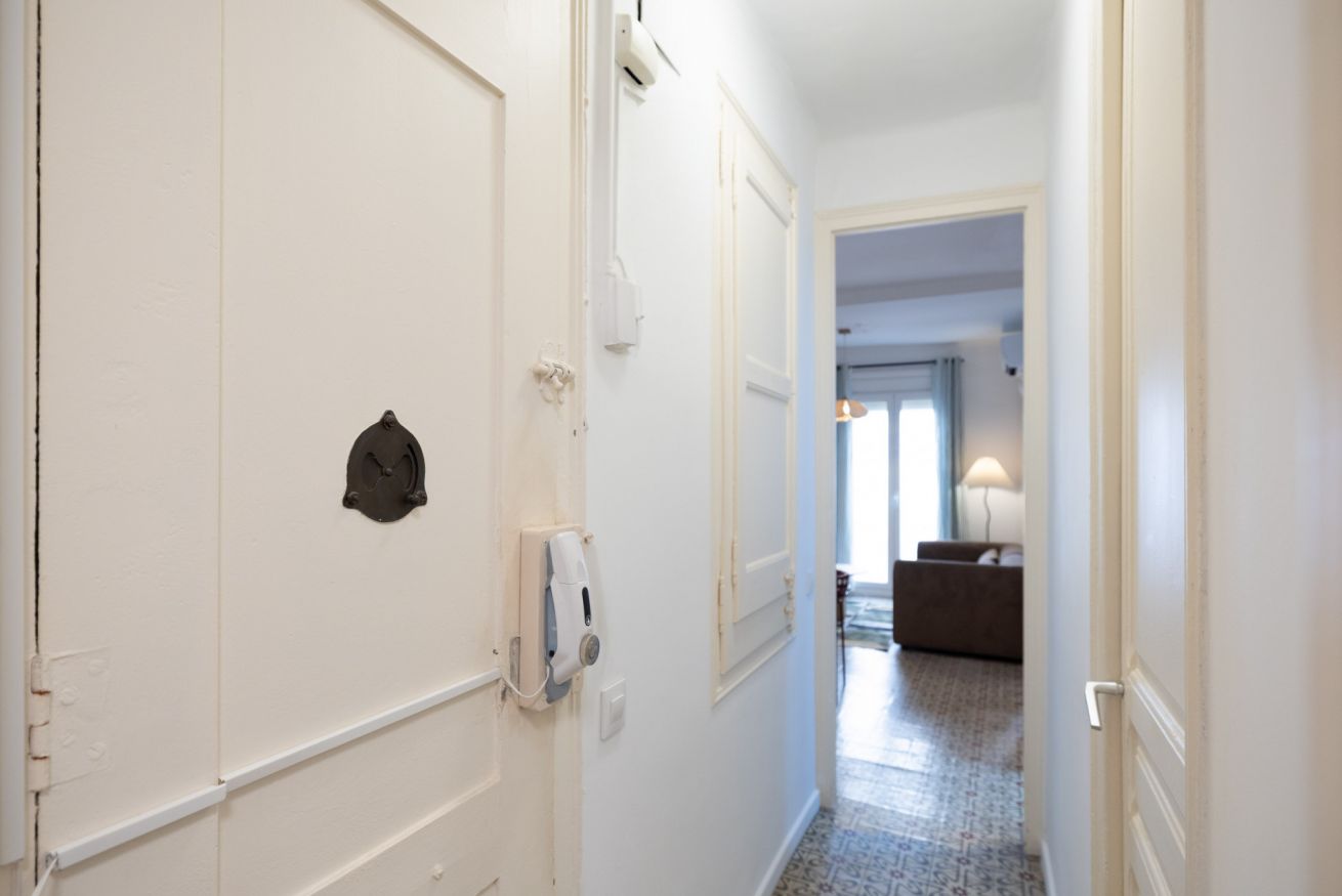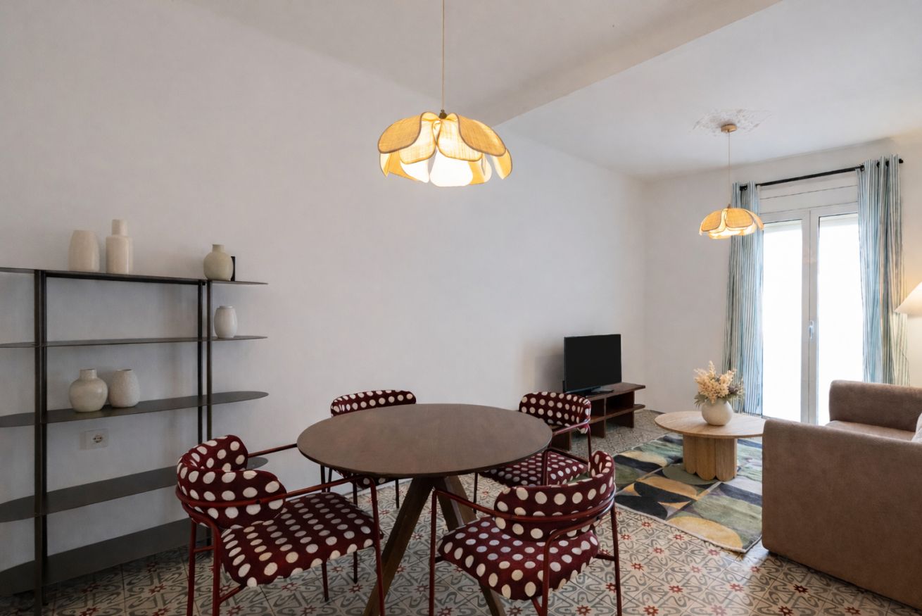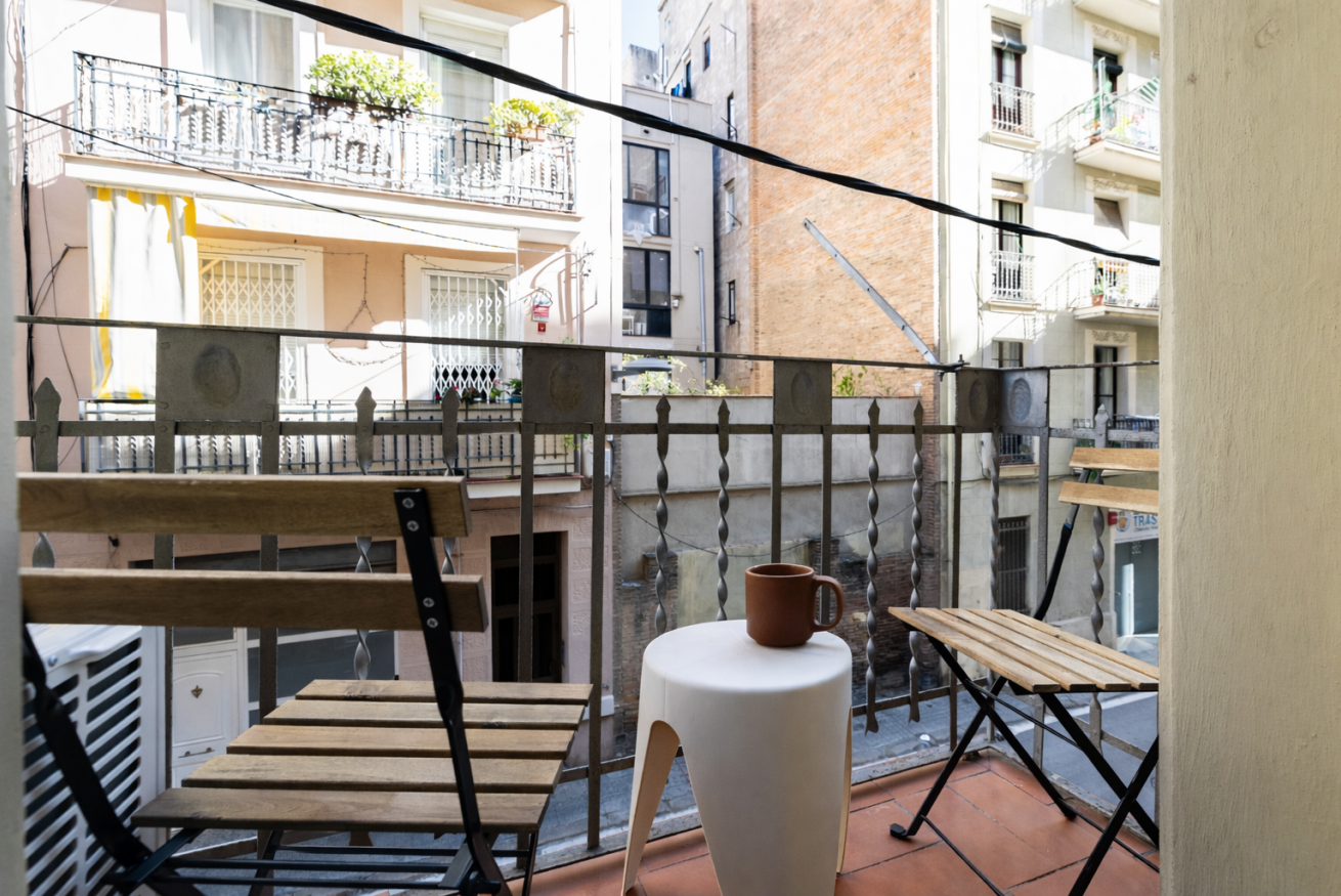 Destaca por su techo de vuelta catalana con vigas de madera a la vista, que aporta carácter y encanto al apartamento. Además, dispone de un balcón con vistas al patio interior de manzana, lo que garantiza tranquilidad y buena iluminación natural.
