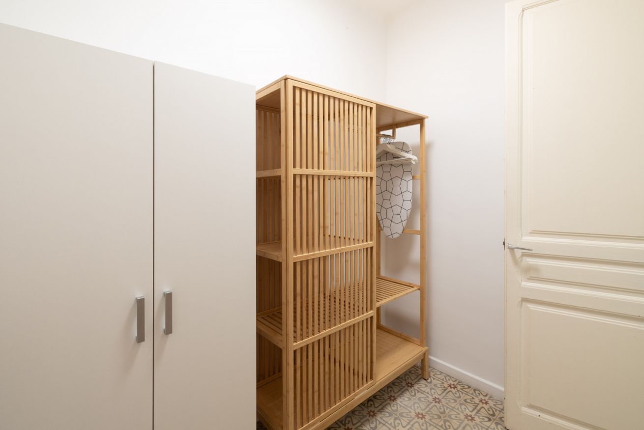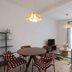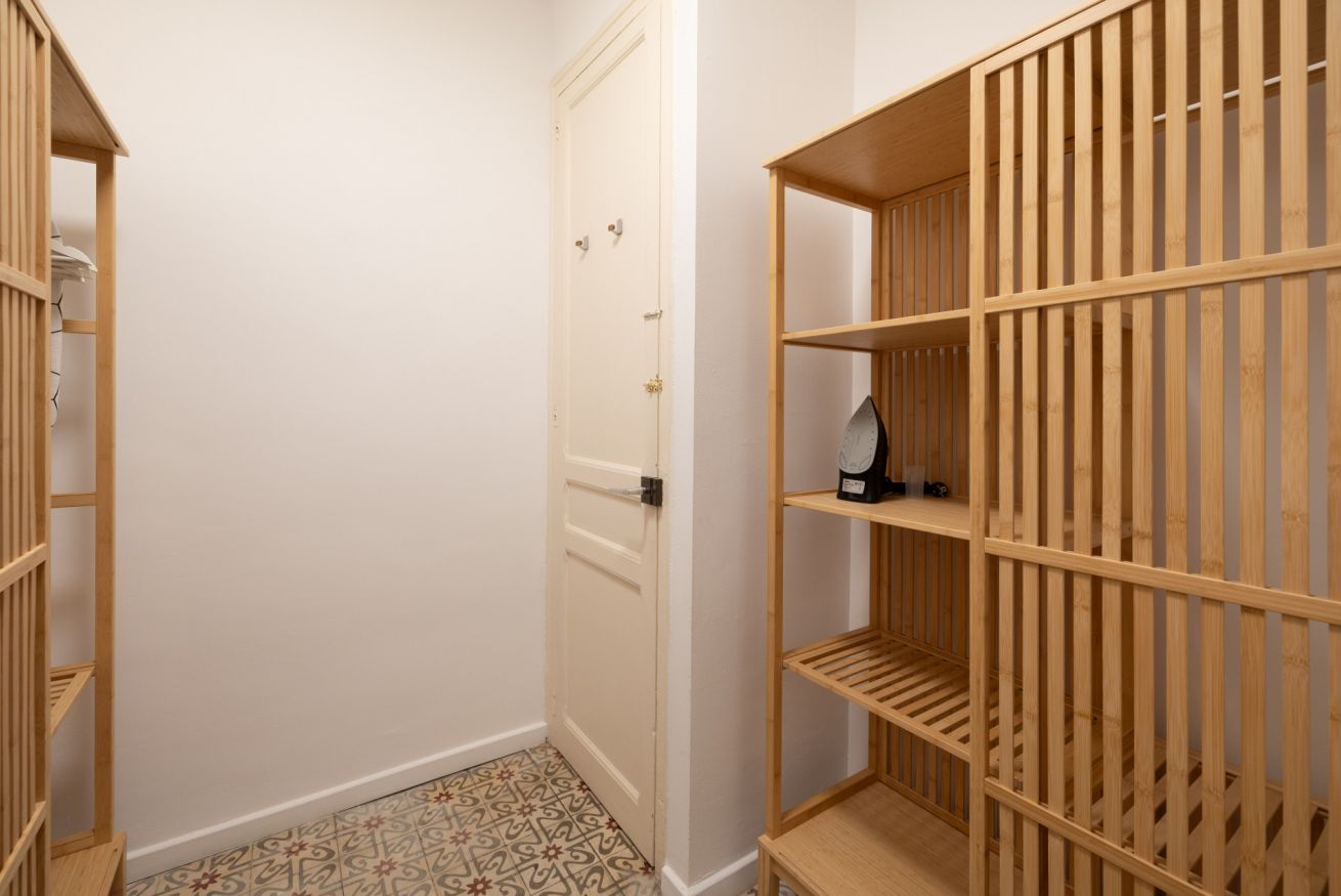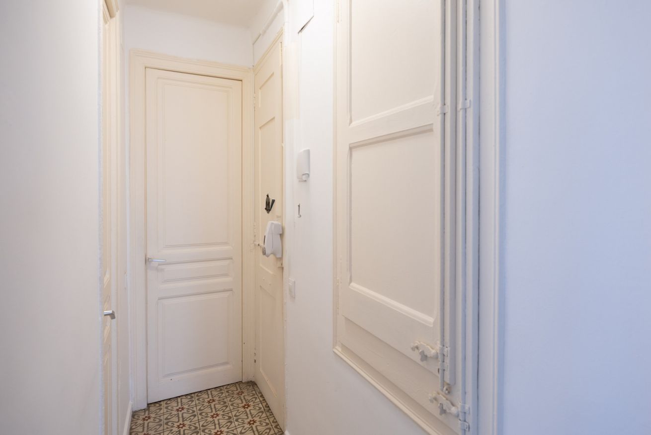 Destaca por su techo de vuelta catalana con vigas de madera a la vista, que aporta carácter y encanto al apartamento. Además, dispone de un balcón con vistas al patio interior de manzana, lo que garantiza tranquilidad y buena iluminación natural.
