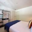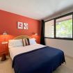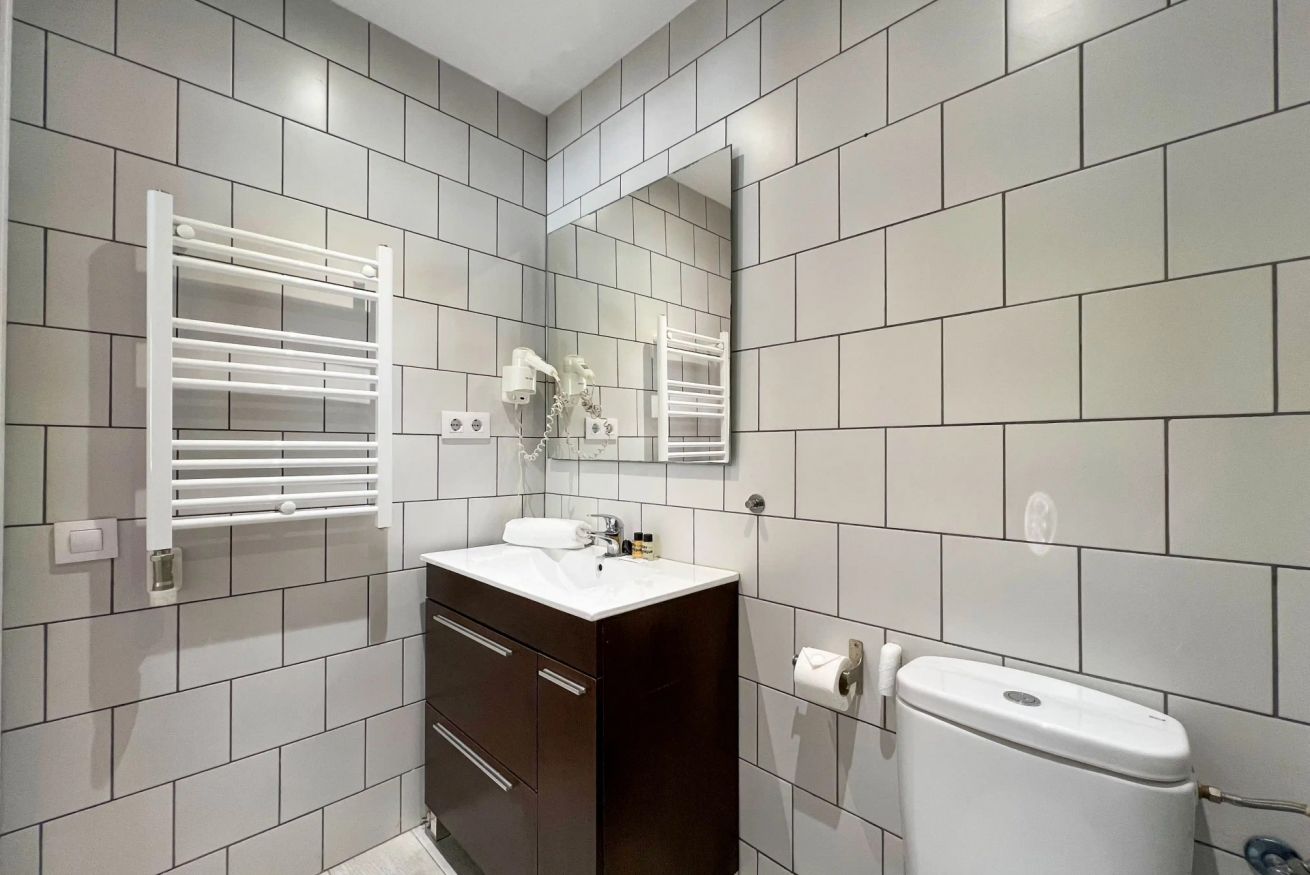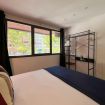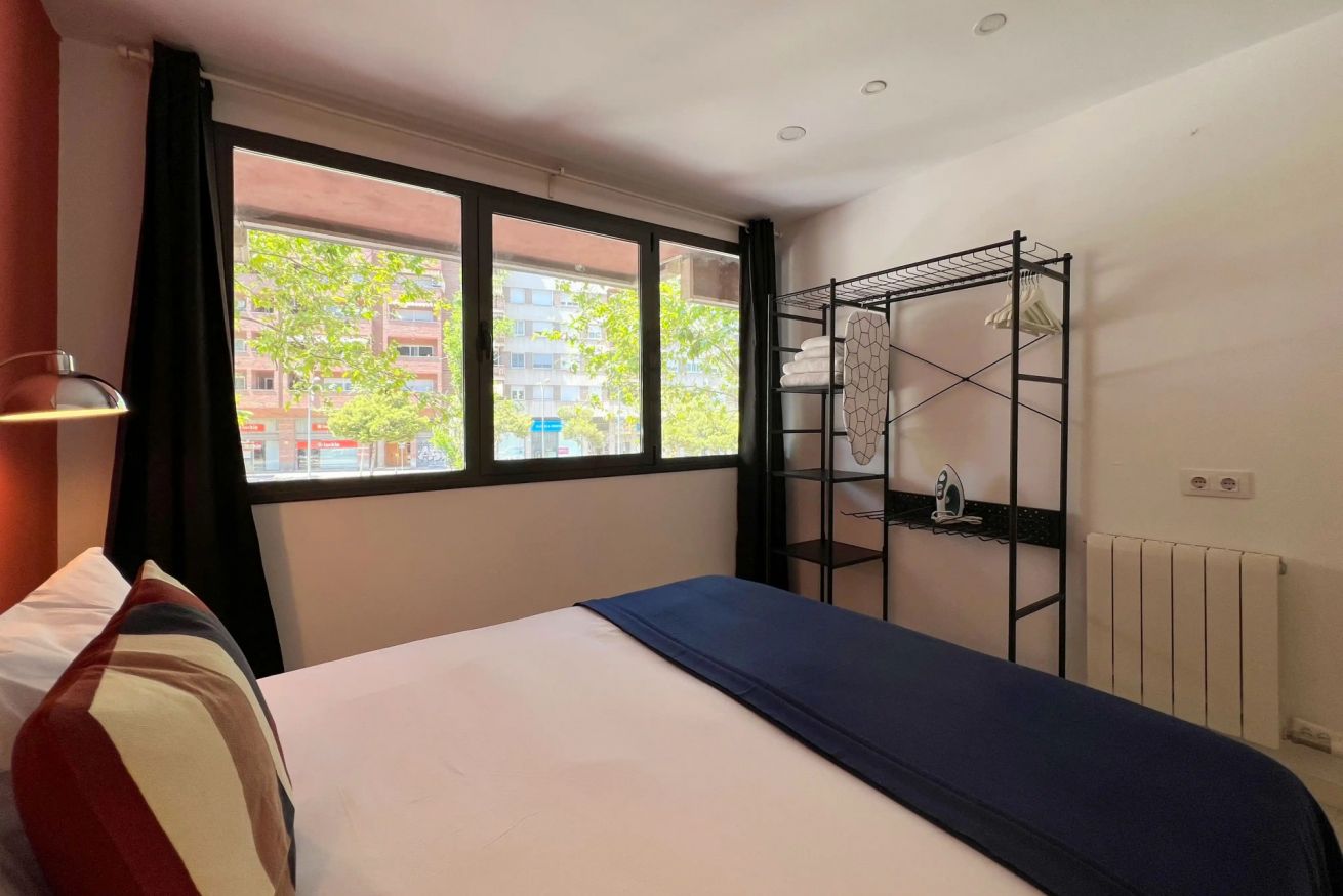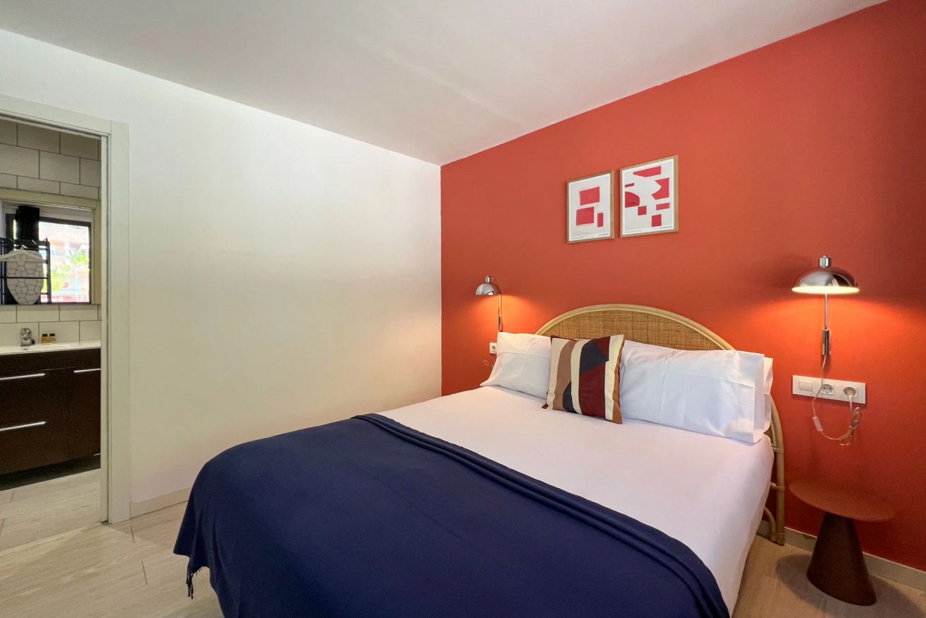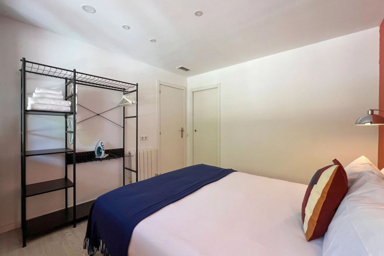 Apartamento diseñado para alojar cómodamente a dos personas, combinando estilo, confort y un espacio único dedicado al bienestar. El dormitorio principal cuenta con una amplia cama doble, iluminación cálida y un práctico armario abierto con espacio para colgar ropa, toallas, plancha y tabla de planchar. Grandes ventanales permiten la entrada de luz natural, creando un ambiente relajante y acogedor.