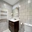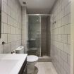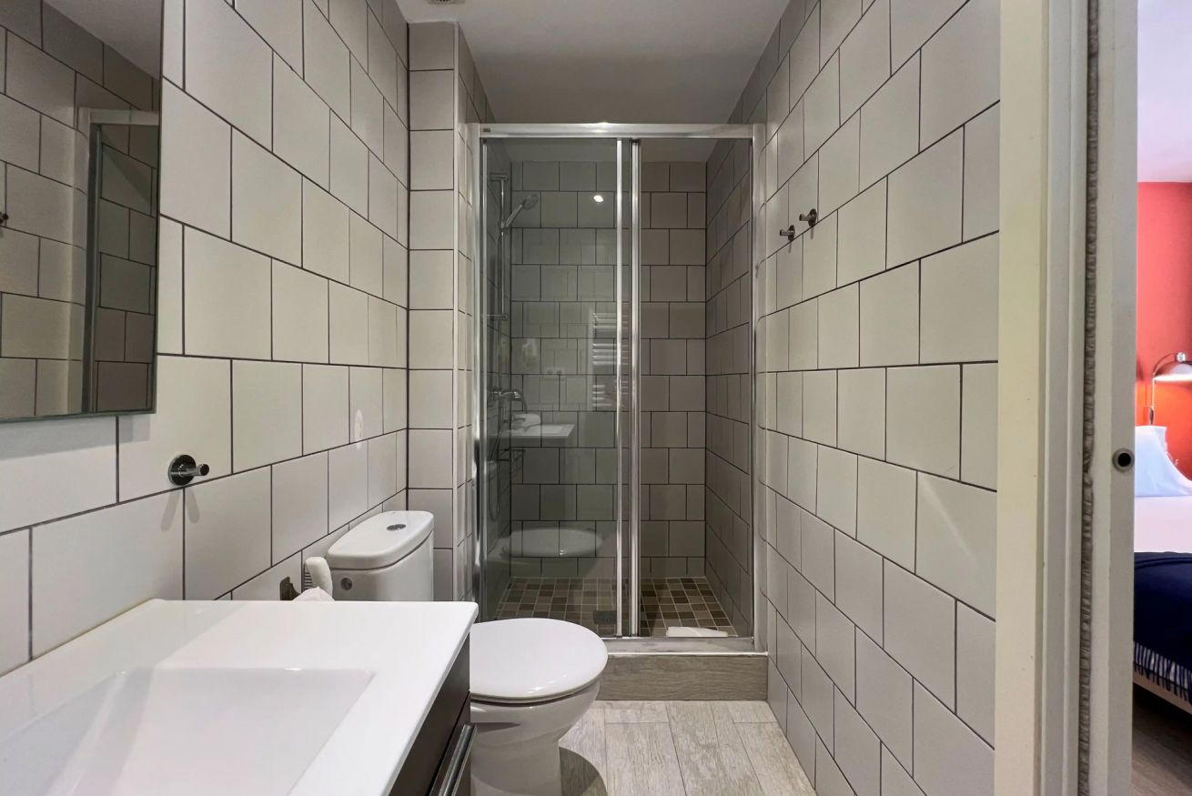 El baño, de estilo minimalista y moderno, está equipado con una amplia ducha tipo cabina de cristal, inodoro y lavabo con mueble de almacenaje, ofreciendo todo lo necesario para una experiencia funcional y elegante.