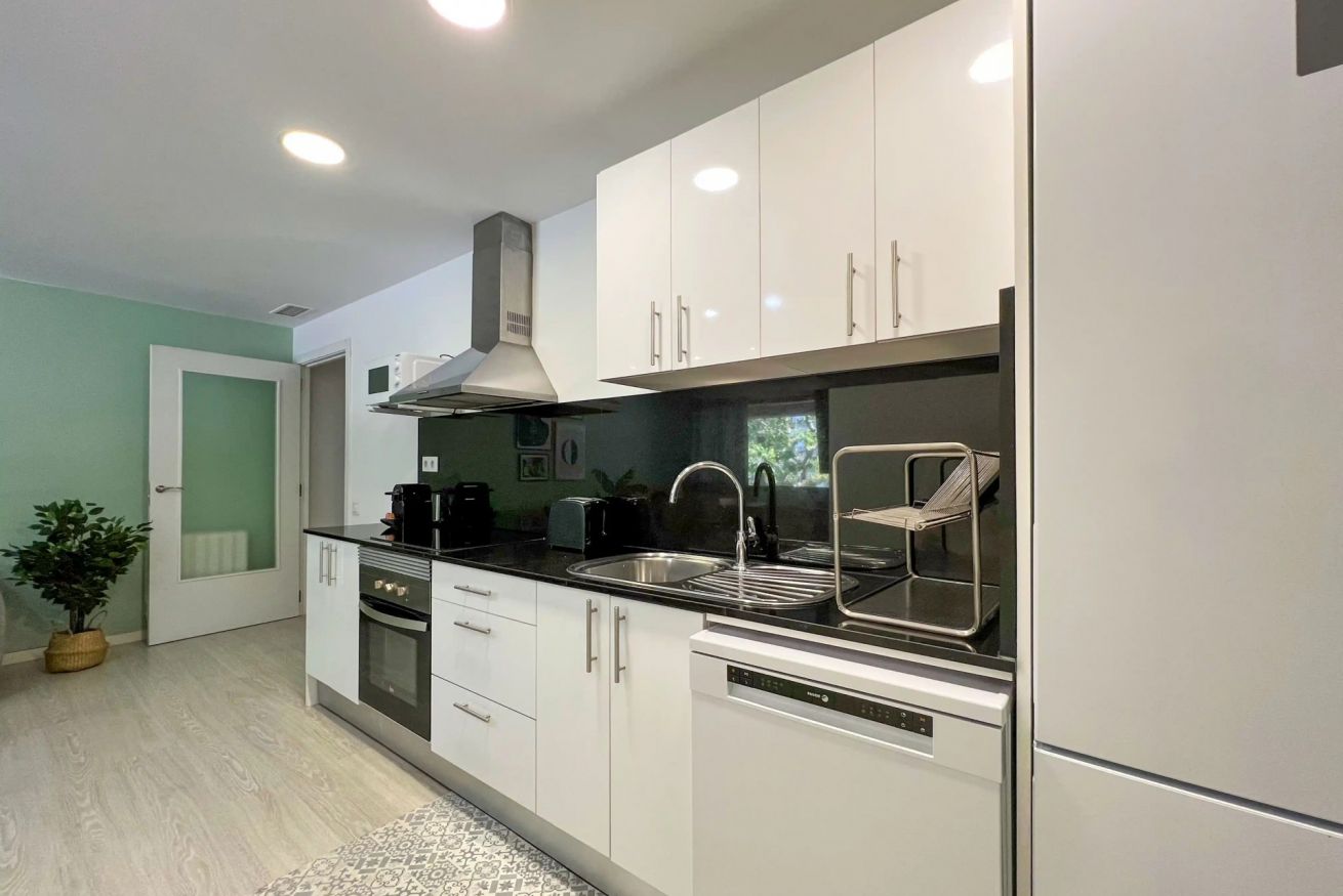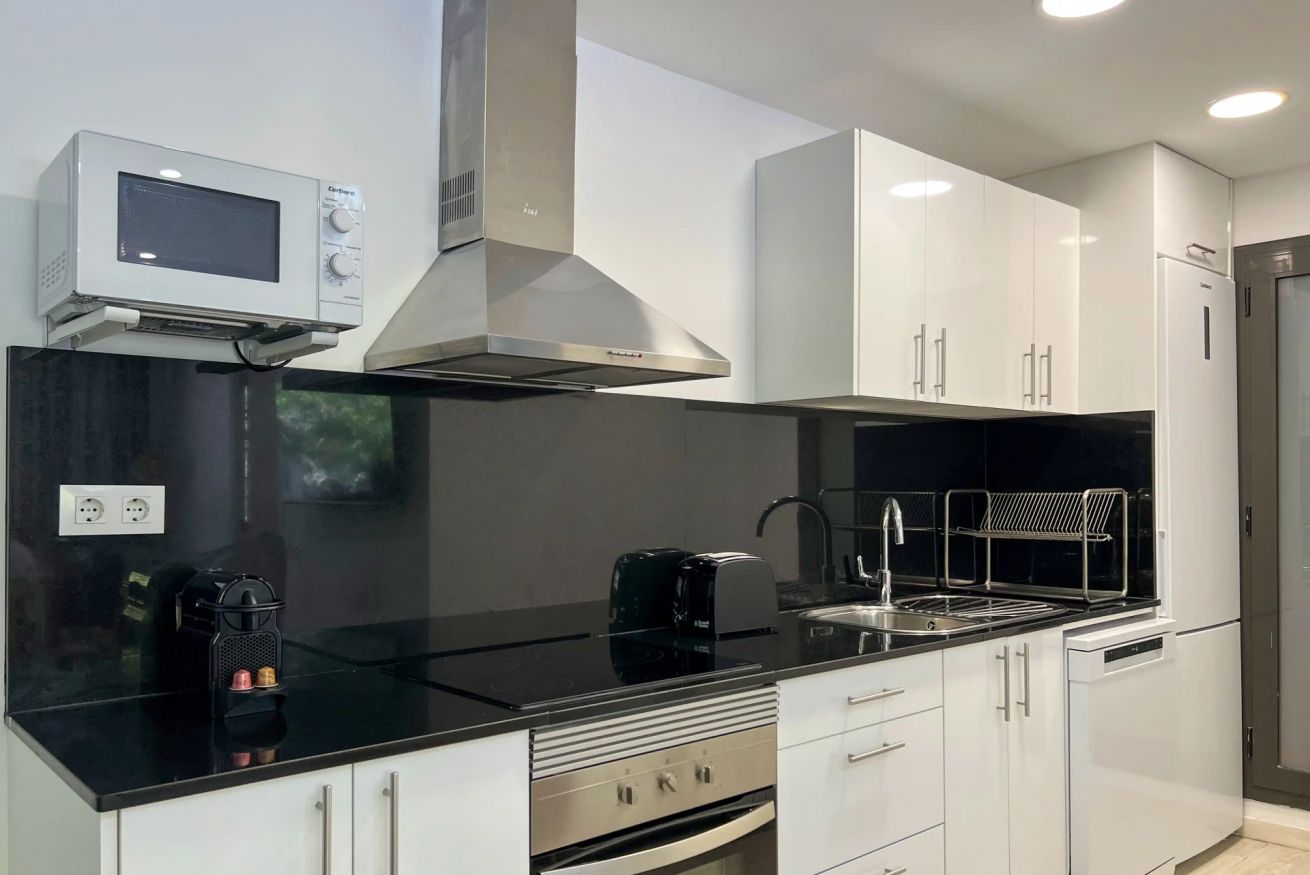 La cocina está totalmente equipada con electrodomésticos modernos: horno, placa vitrocerámica, microondas, lavavajillas, tostadora, cafetera y nevera grande. Además, el apartamento cuenta con lavadora, lo que lo hace ideal para estancias largas.