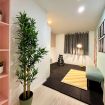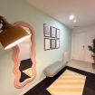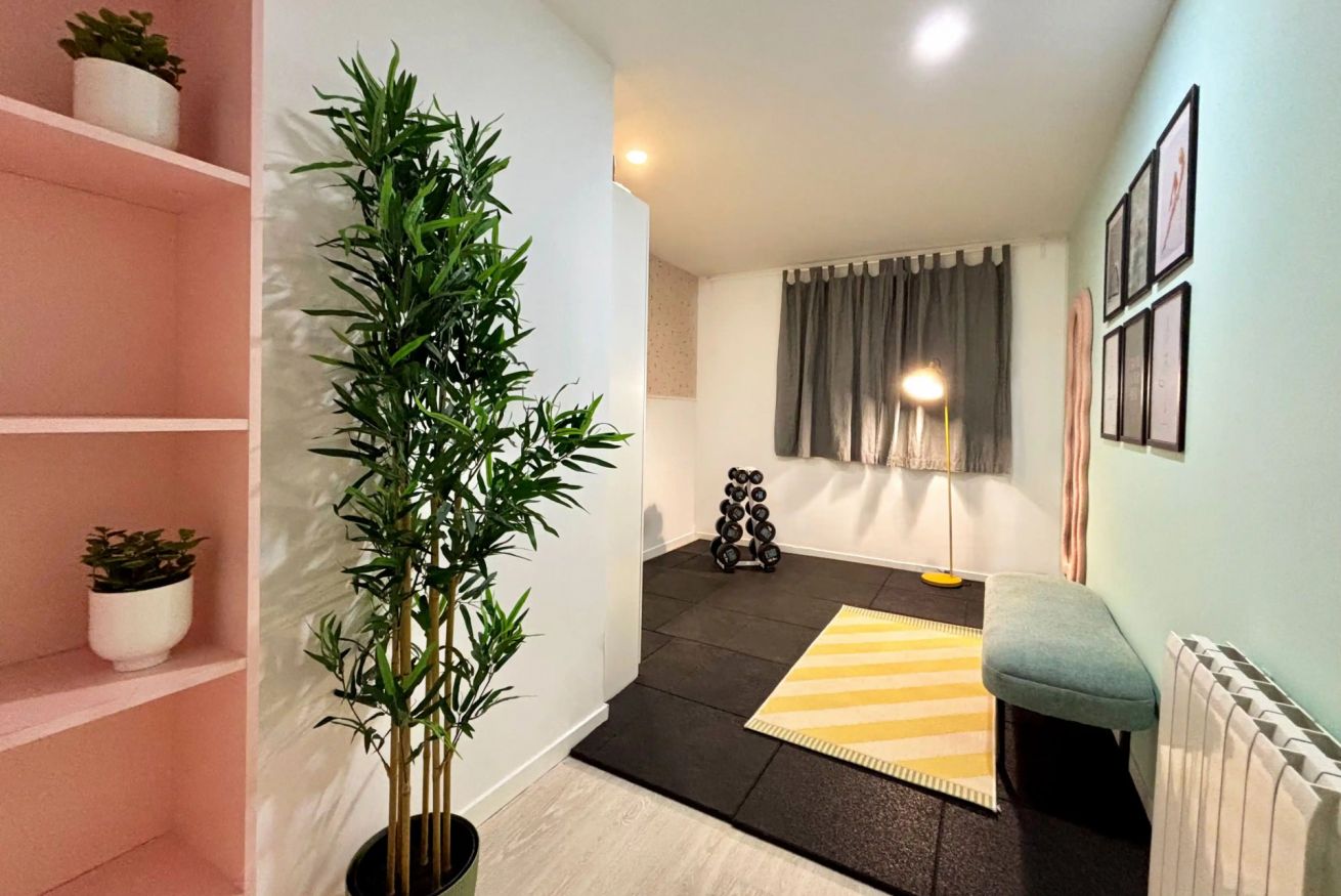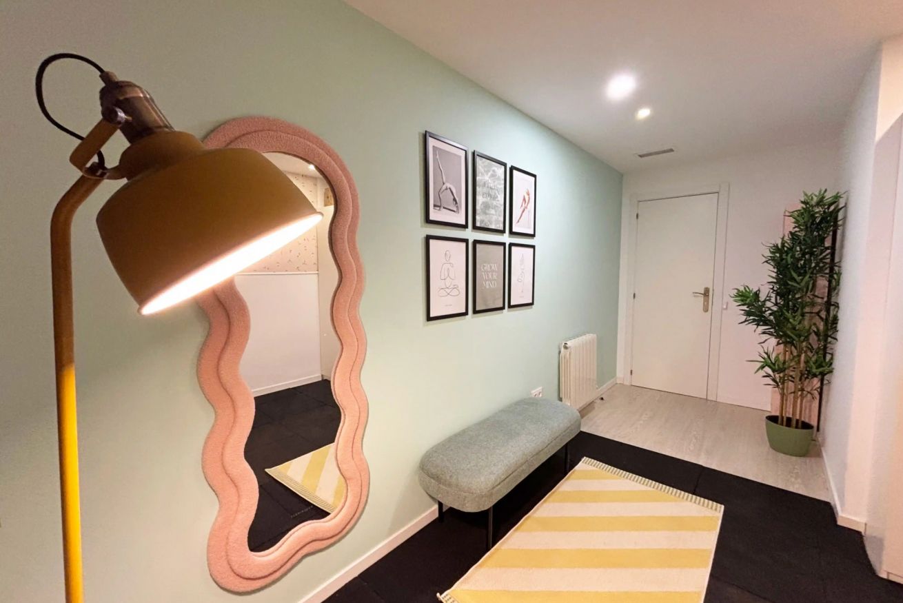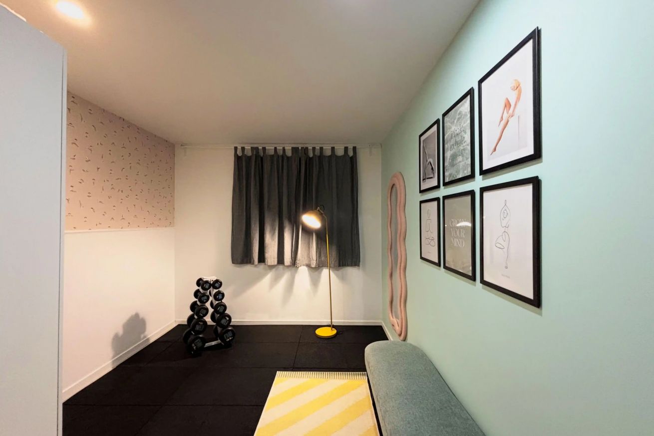 El corazón del apartamento es su exclusivo Yoga Corner, un espacio diseñado para la relajación y el equilibrio. Decorado con colores suaves, cuadros inspiradores y detalles como un banco tapizado, alfombra, espejo de diseño ondulado, iluminación ambiental, plantas y un set de pesas, este rincón es perfecto para practicar yoga, meditación, estiramientos o simplemente desconectar después de un día en la ciudad.
