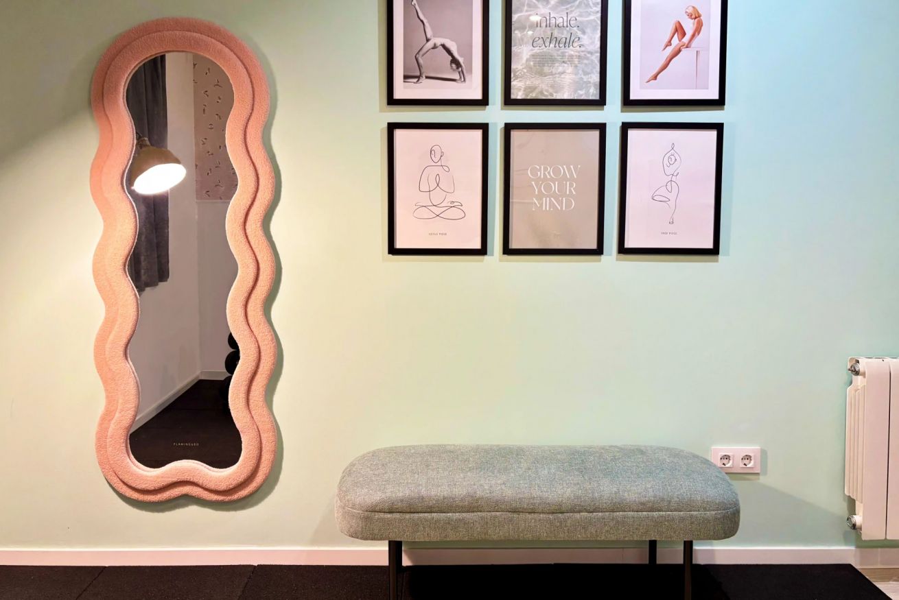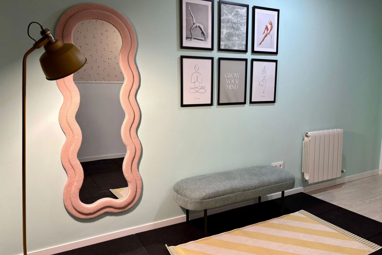 Este rincón de yoga fue diseñado como un espacio de calma y reconexión, donde el equilibrio entre funcionalidad y estética promueve el bienestar integral. Los tonos pastel predominan como una forma de transmitir serenidad y calidez, mientras que las formas orgánicas y los elementos naturales invitan a la pausa y al movimiento consciente. El espejo de forma ondulada no solo amplía visualmente el espacio, sino que también refuerza la sensación de fluidez y ligereza. Los detalles decorativos completan una atmósfera armoniosa que invita a habitar el presente: un rincón donde el diseño abraza al bienestar.