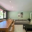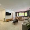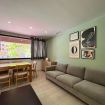La zona de estar destaca por su amplitud y luminosidad gracias a sus ventanales panorámicos. Dispone de un cómodo sofá de tres plazas, televisión de pantalla plana y una mesa de comedor de madera perfecta tanto para disfrutar de comidas tranquilas como para trabajar cómodamente desde casa.