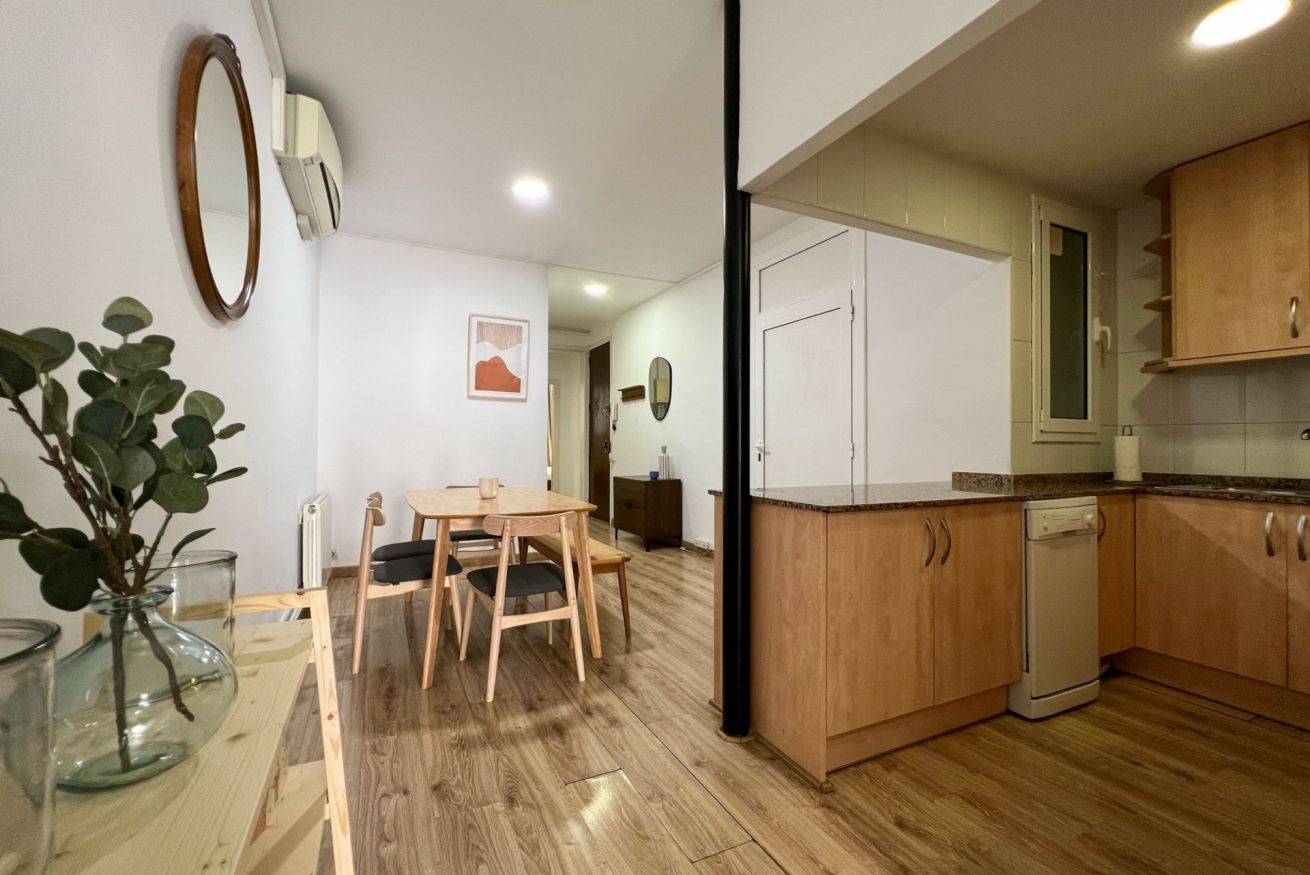 La zona de estar se encuentra en el centro del apartamento, lo que hace que sea fácil moverse por el espacio. El apartamento tiene un bonito suelo y una decoración discreta de buen gusto.