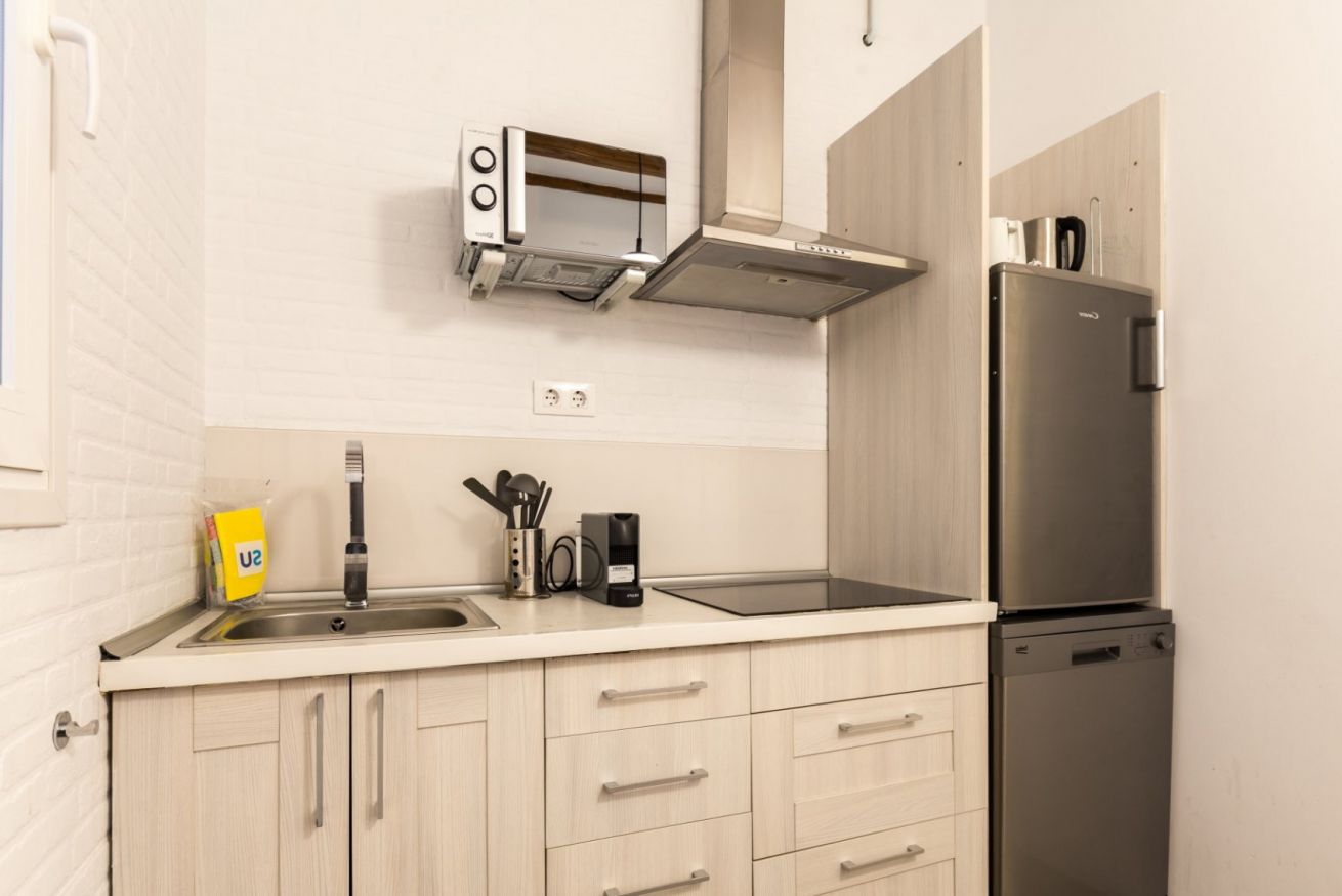 La cocina cuenta con todo lo necesario y electrodomesticos en muy buen estado, es amplia y moderna. La sala y el comedor se encuentran en un solo ambiente amplio, con dos grandes ventanales con balcón que permiten que entre la luz del día y disfrutar de las vistas de las calles de Barcelona.
