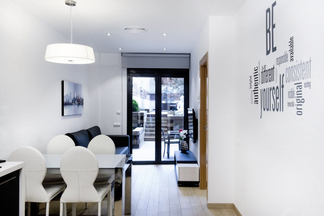 Aunque puede que quieras pasar el tiempo explorando los famosos restaurantes de Barcelona, existe la opción de una comida casera, ya que la cocina está equipada con todos los requisitos y comodidades, lo que te permite sentirte como en casa, lejos de casa. El salón está situado al lado de la cocina, con un cómodo comedor al lado de la cocina y un sofá para pasar un rato fresco y relajado después de un día ajetreado. El apartamento tiene una decoración contemporánea de lujo, un agradable y luminoso salón con un televisor de pantalla plana de 43 pulgadas.