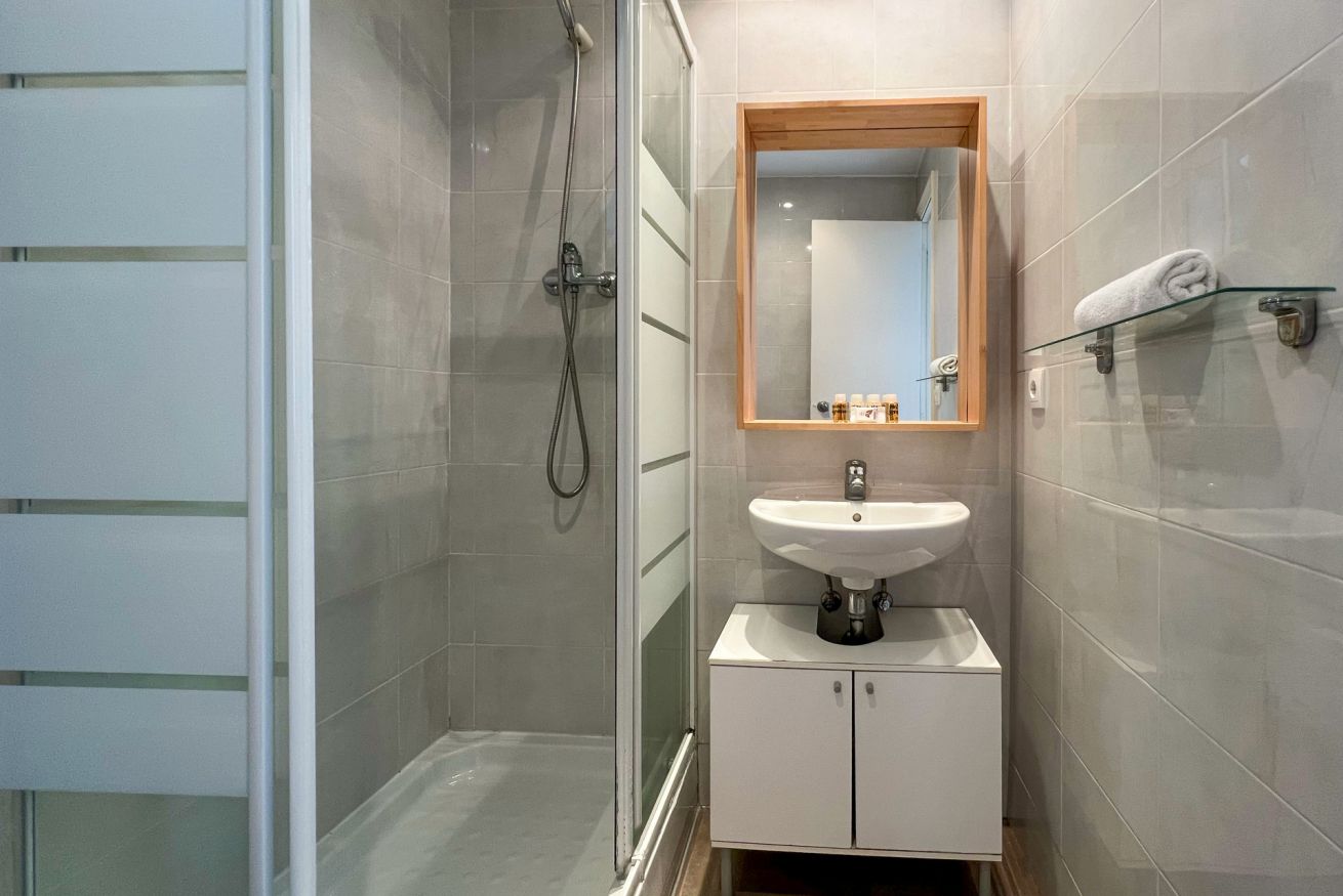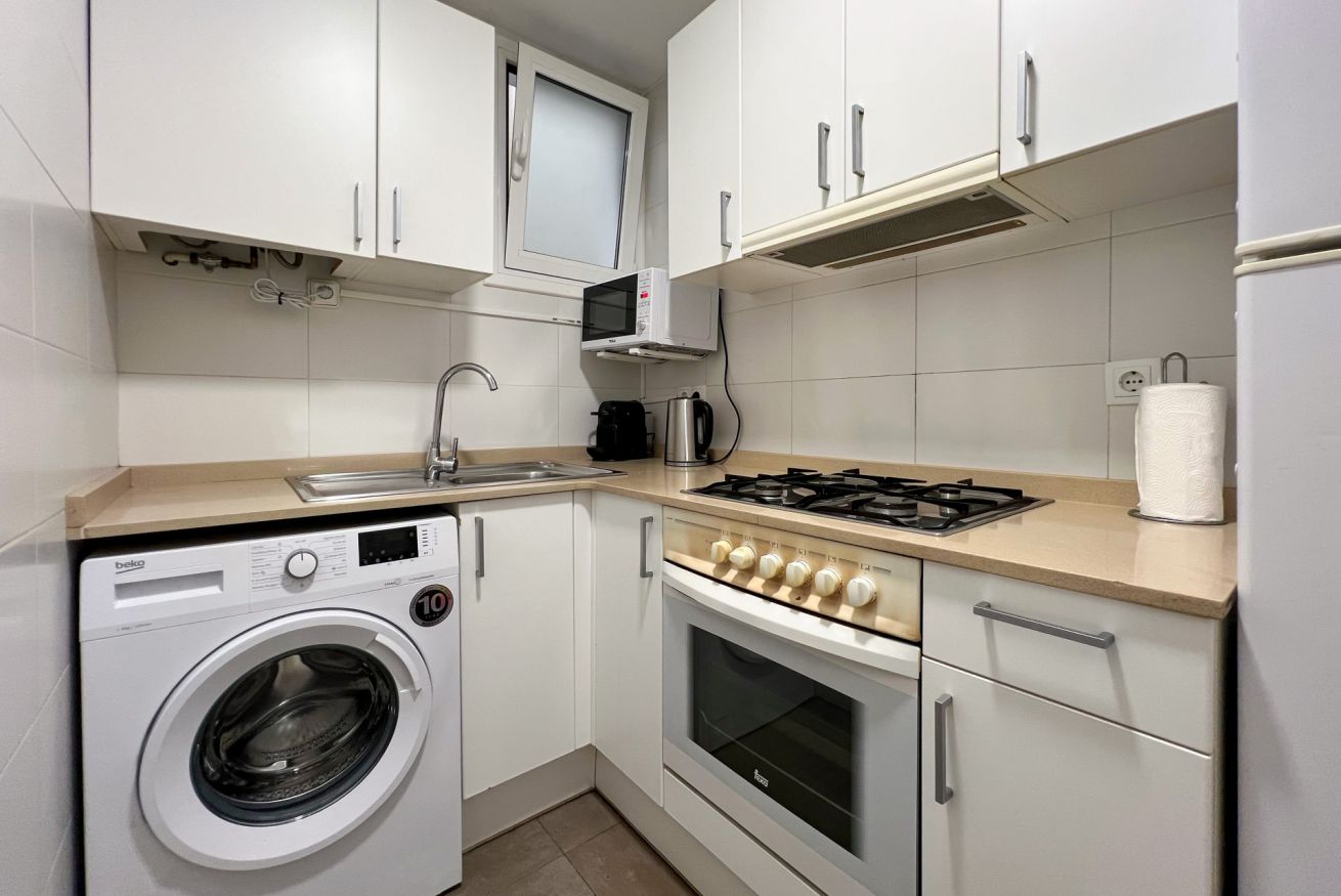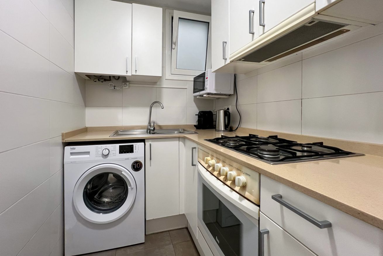 La cocina, totalmente equipada, cuenta con todo lo necesario para preparar tus comidas, y el baño moderno y luminoso garantiza frescura y comodidad.
