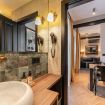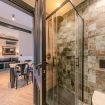 El baño es otra joya del apartamento: decorado con azulejos artesanales en tonos verdes y tierra, cuenta con un lavabo de piedra sobre encimera de madera natural, grifería dorada empotrada y una ducha con mampara de cristal y rociador tipo lluvia.