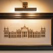 El dormitorio, es un remanso de calma. La cama doble de gran tamaño con cabecera en color turquesa es el centro visual del espacio. Las paredes mantienen el ladrillo visto como protagonista, enmarcando obras gráficas clásicas que refuerzan el carácter elegante del ambiente. La doble cortina, con visillo blanco y cortinas opacas en tono dorado, asegura intimidad y confort.