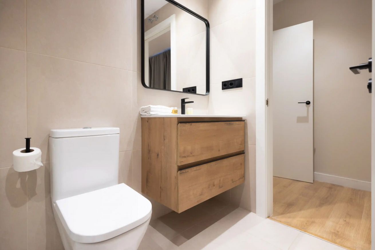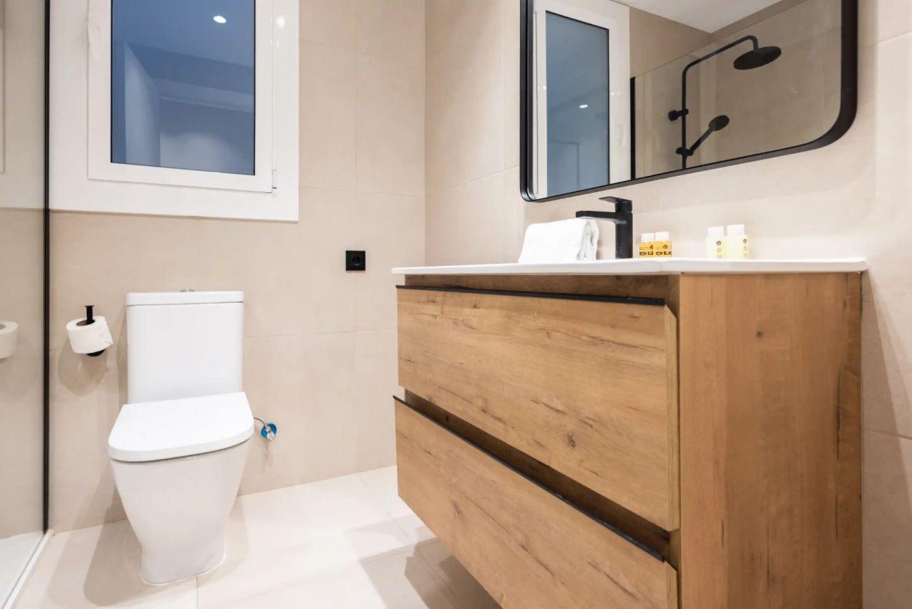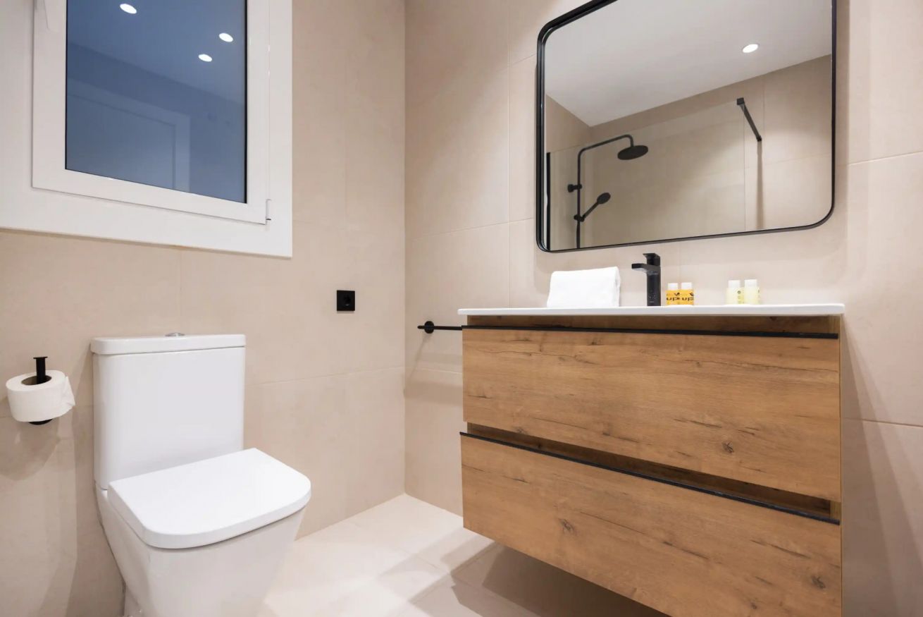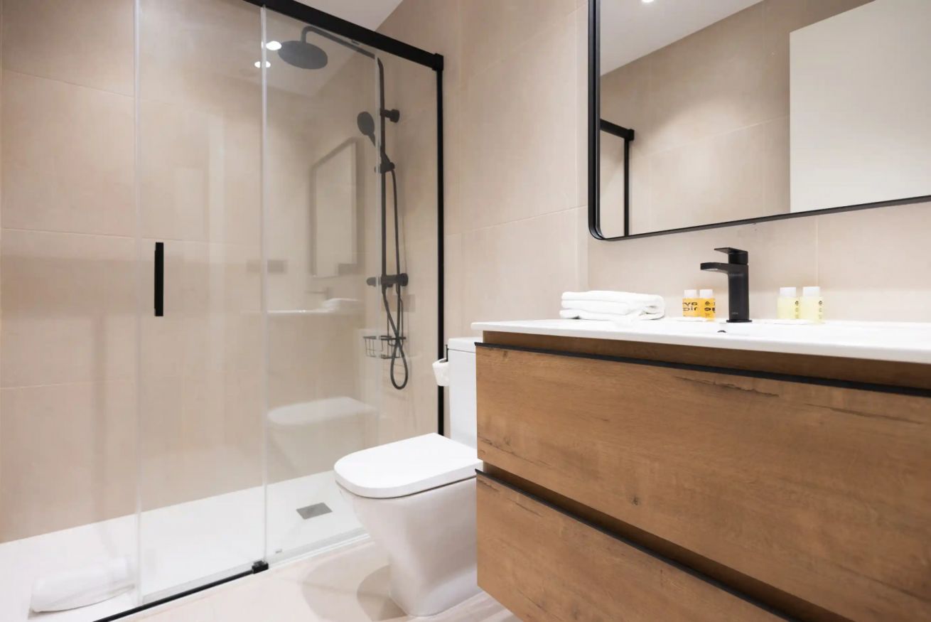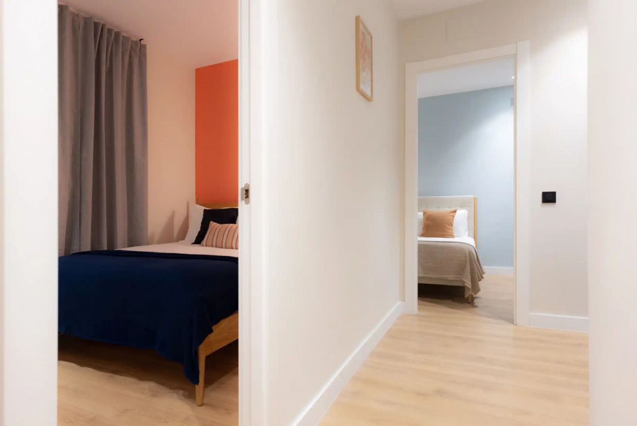 El apartamento cuenta con tres habitaciones: una con cama doble y dos con camas individuales, ofreciendo comodidad para hasta cinco personas. Además, dispone de dos baños completos que garantizan confort y un final relajante para tu día.