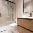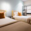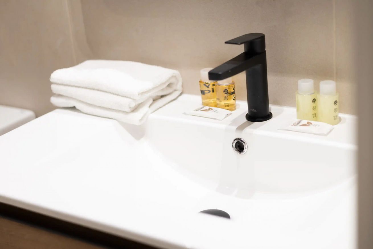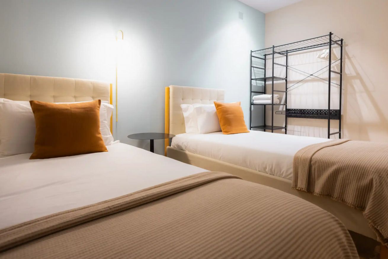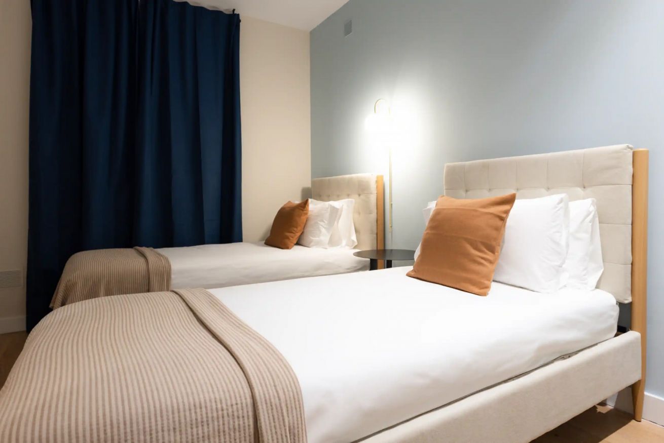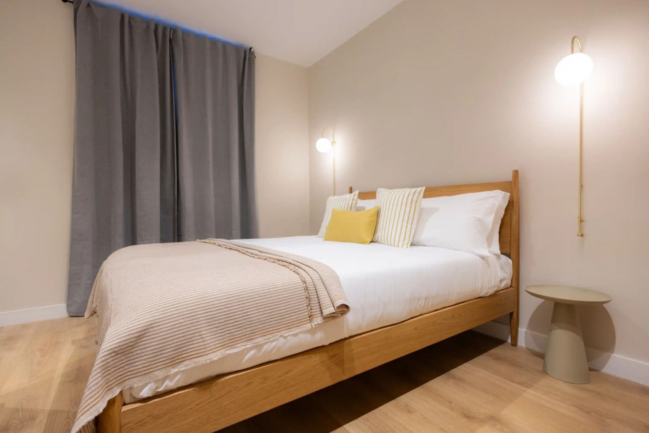 El apartamento cuenta con tres habitaciones: una con cama doble y dos con camas individuales, ofreciendo comodidad para hasta cinco personas. Además, dispone de dos baños completos que garantizan confort y un final relajante para tu día.