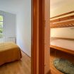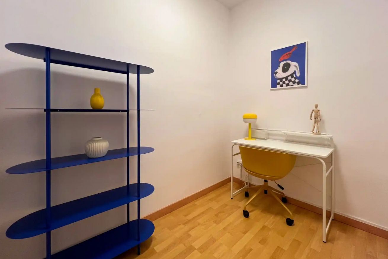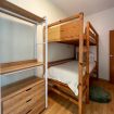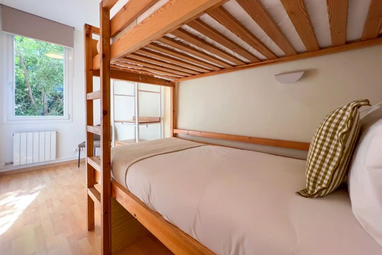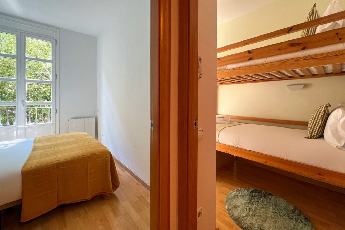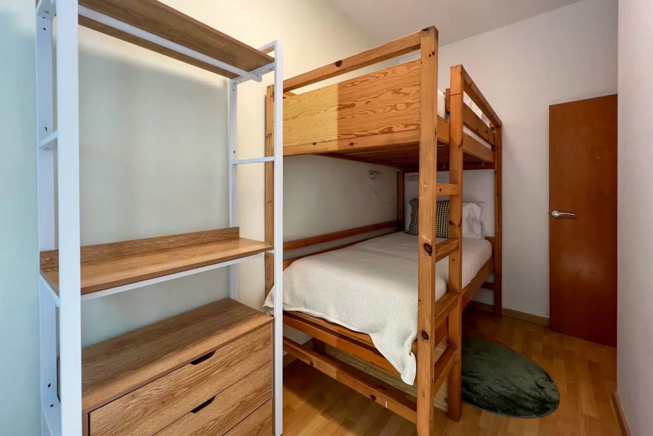 Dispone de dos habitaciones: una con cama doble y otra habitación con dos camas individuales tipo litera, además de un espacio independiente con escritorio, ideal para trabajar durante la estancia.