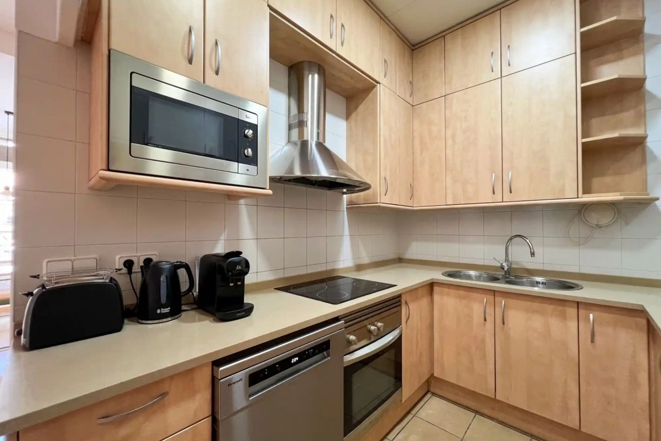 La cocina, moderna y funcional, está completamente equipada con horno, vajilla y cubertería, sartenes, cafetera, lavavajillas, hervidor eléctrico, refrigerador, microondas, tostadora y lavadora. El baño es completo, con ducha y todo lo necesario para tu estancia.