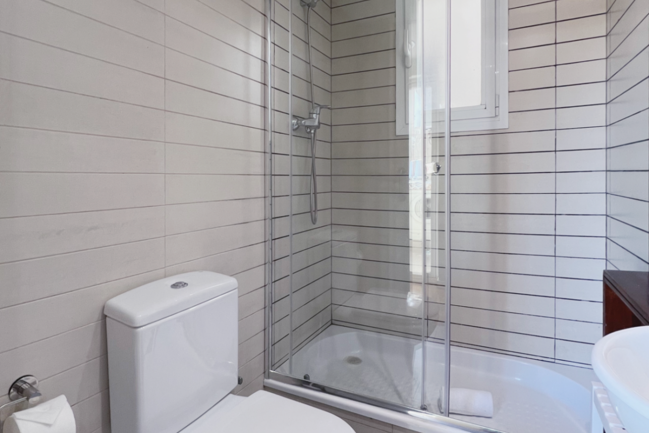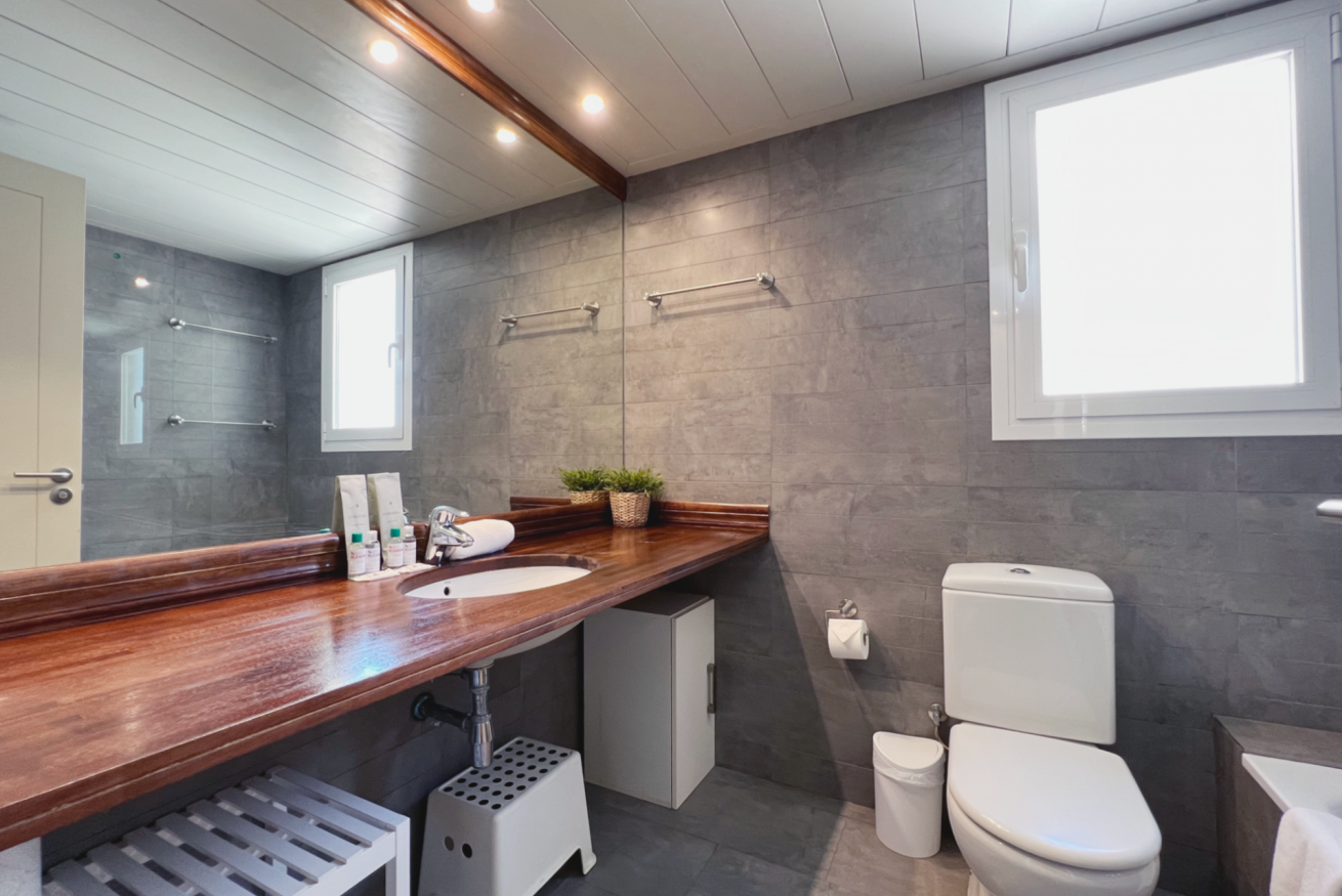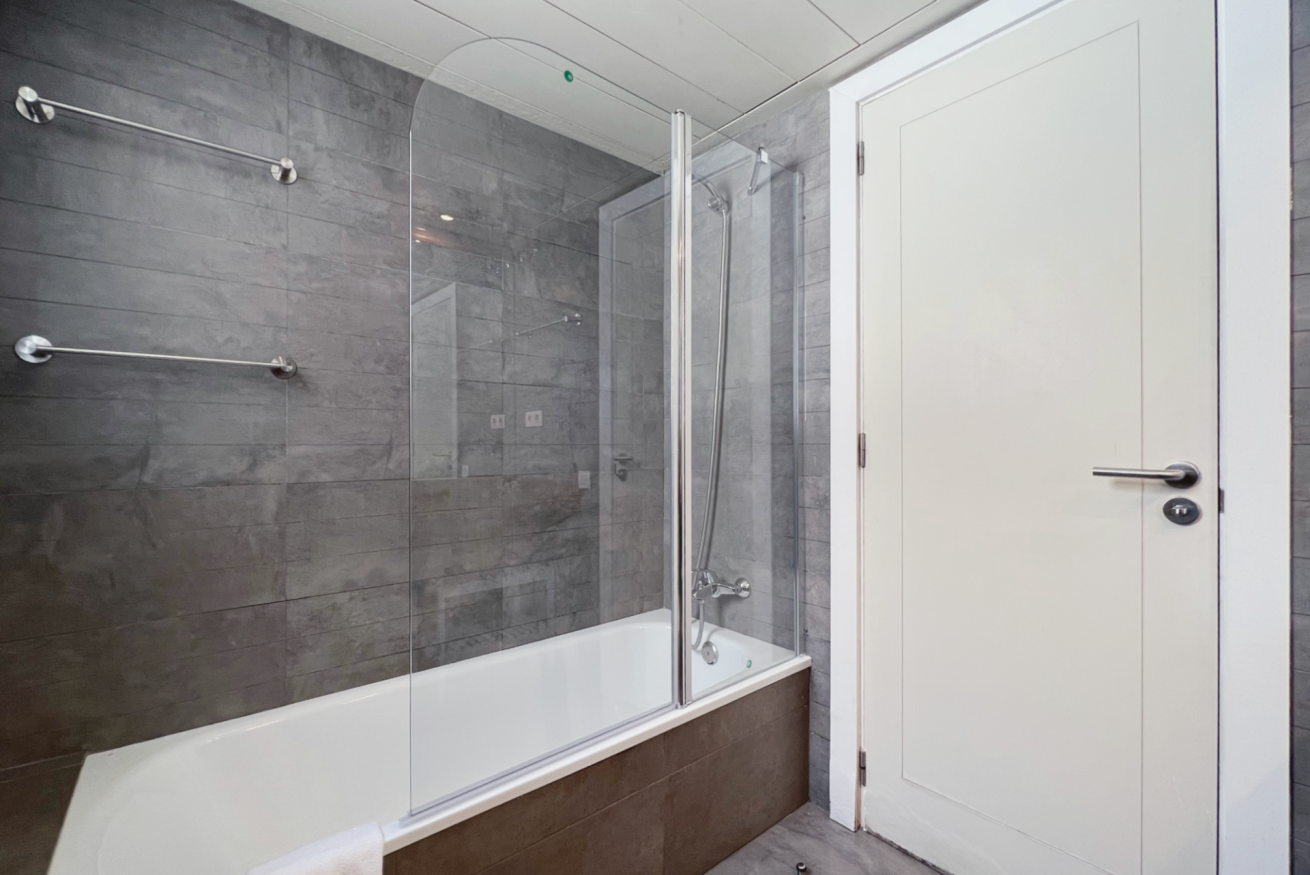 Este espacioso apartamento tiene 2 baños completos. El dormitorio 1 tiene un baño ensuite con bañera. El baño 2 tiene una ducha. Los baños tienen todo lo necesario, desde toallas hasta artículos de aseo.