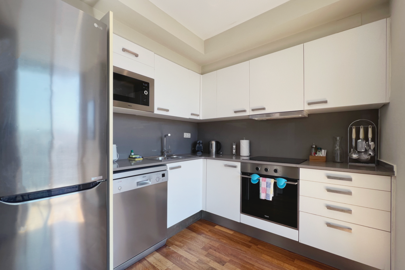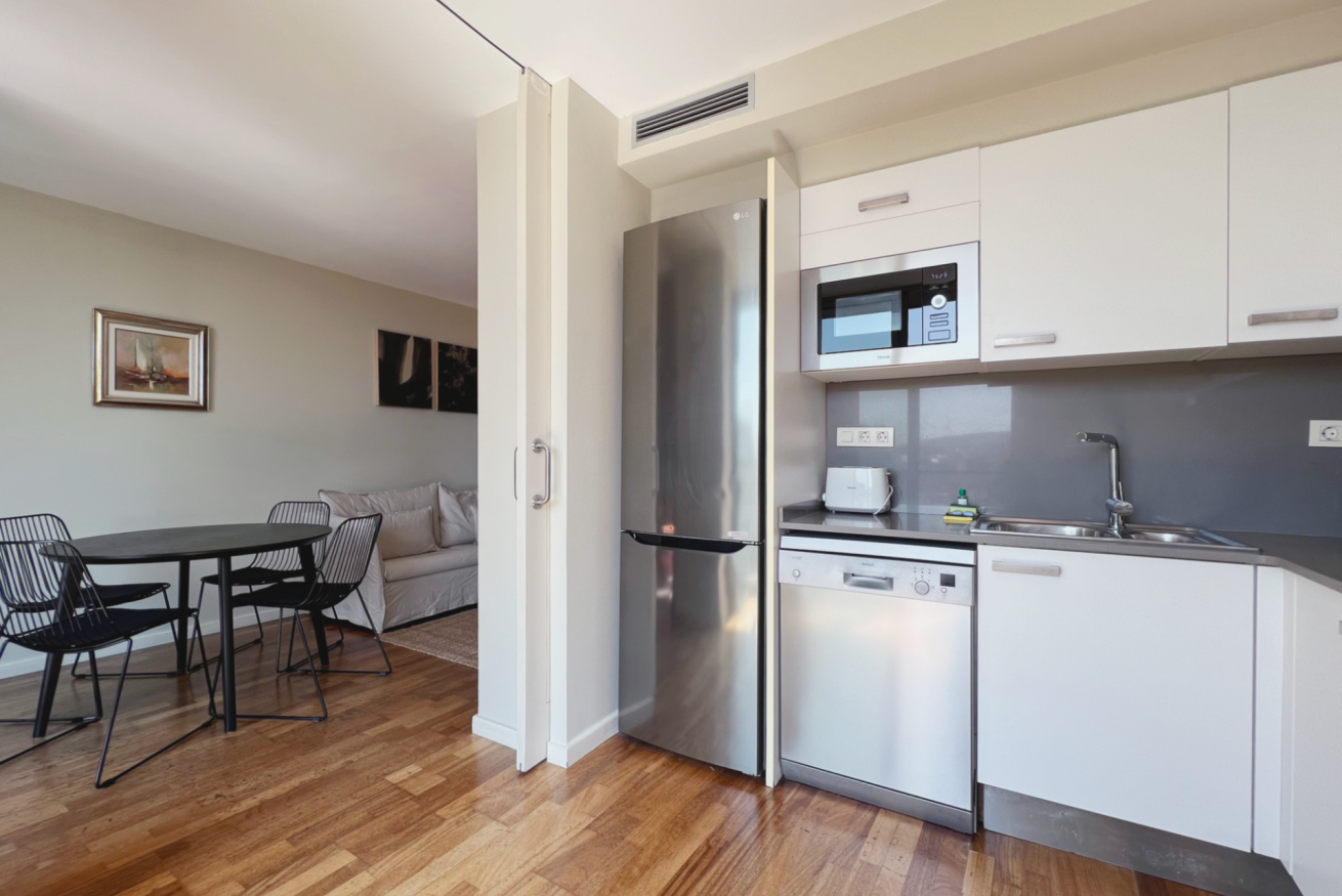 La cocina está totalmente equipada, en la que podrá cocinar sabrosos platos y disfrutarlos junto a su familia o amigos en la zona de comedor. La cocina y la sala de estar están conectadas a través de una puerta corredera, al abrirla tendrás una zona muy espaciosa.