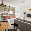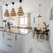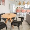 El corazón de nuestro apartamento es el salón principal, un espacio diáfano donde se integra la sala de estar y la cocina. Aquí encontrarás un cómodo sillón para relajarte después de un día de exploración, un televisor para entretenimiento, un desayunador con banquetas para comidas rápidas, una mesa con cómodas sillas para comidas más formales y todos los electrodomésticos necesarios, incluyendo una lavadora para tu conveniencia.