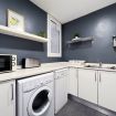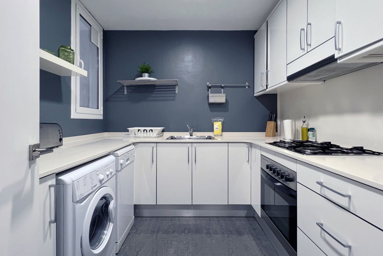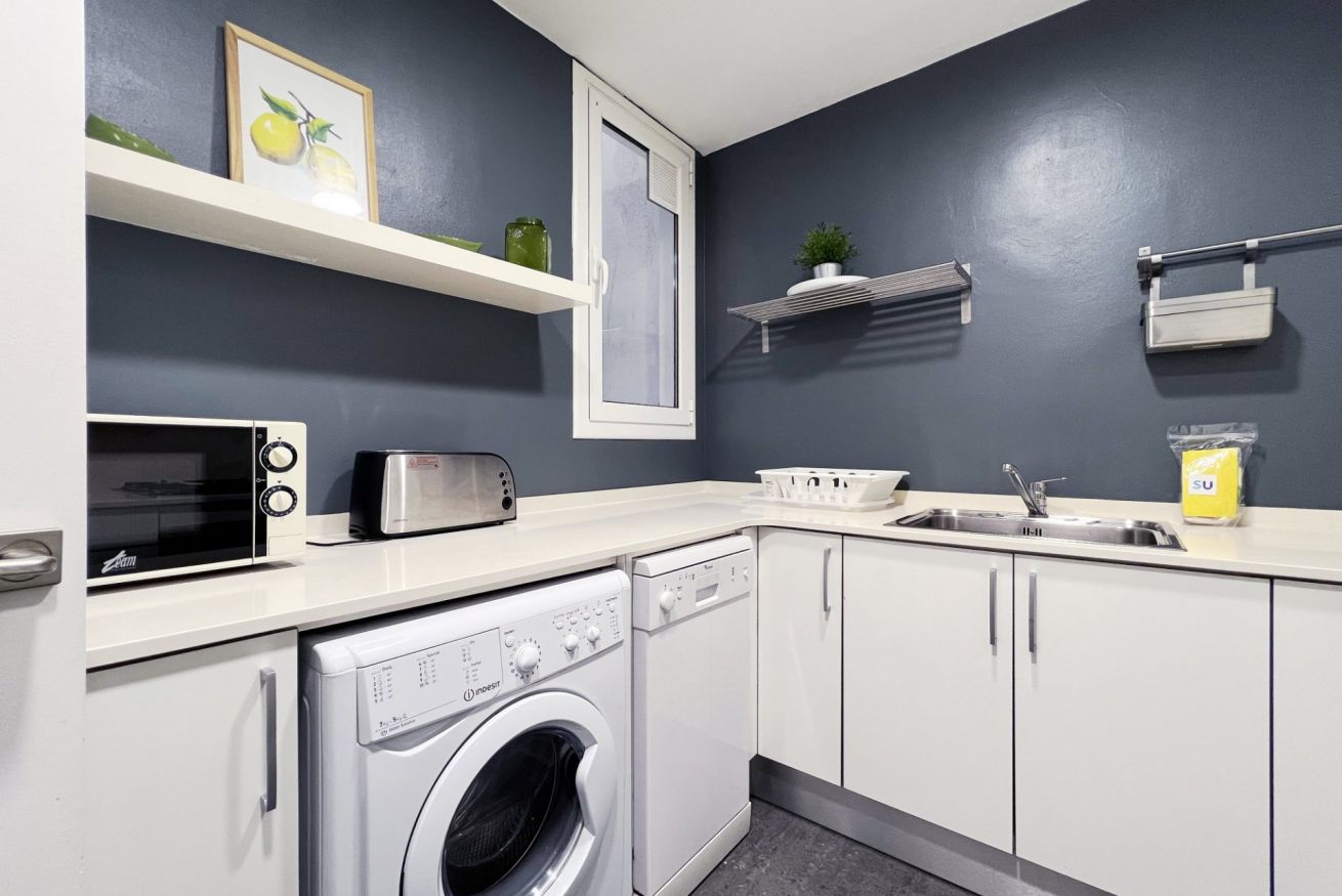 Aunque puede que quieras pasar el tiempo explorando los famosos restaurantes de Barcelona, a veces no hay nada como una comida preparada en casa. Y este apartamento tiene una cocina totalmente equipada con todo lo necesario para facilitar la preparación de las comidas. Los gabinetes personalizados ofrecen mucho espacio para almacenar los comestibles favoritos de su familia, y los electrodomésticos modernos, incluyendo un lavaplatos, facilitan la preparación de las comidas para su familia hambrienta.
