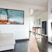 La zona de estar se encuentra en el centro del apartamento, lo que facilita la movilidad. Encontrará sofás de alta gama, obras de arte abstracto y accesorios y decoración contemporánea. El espacio, en su mayor parte blanco y acentuado con chasquidos de color, es el lugar perfecto para ponerse al día con la conversación o ver la televisión.