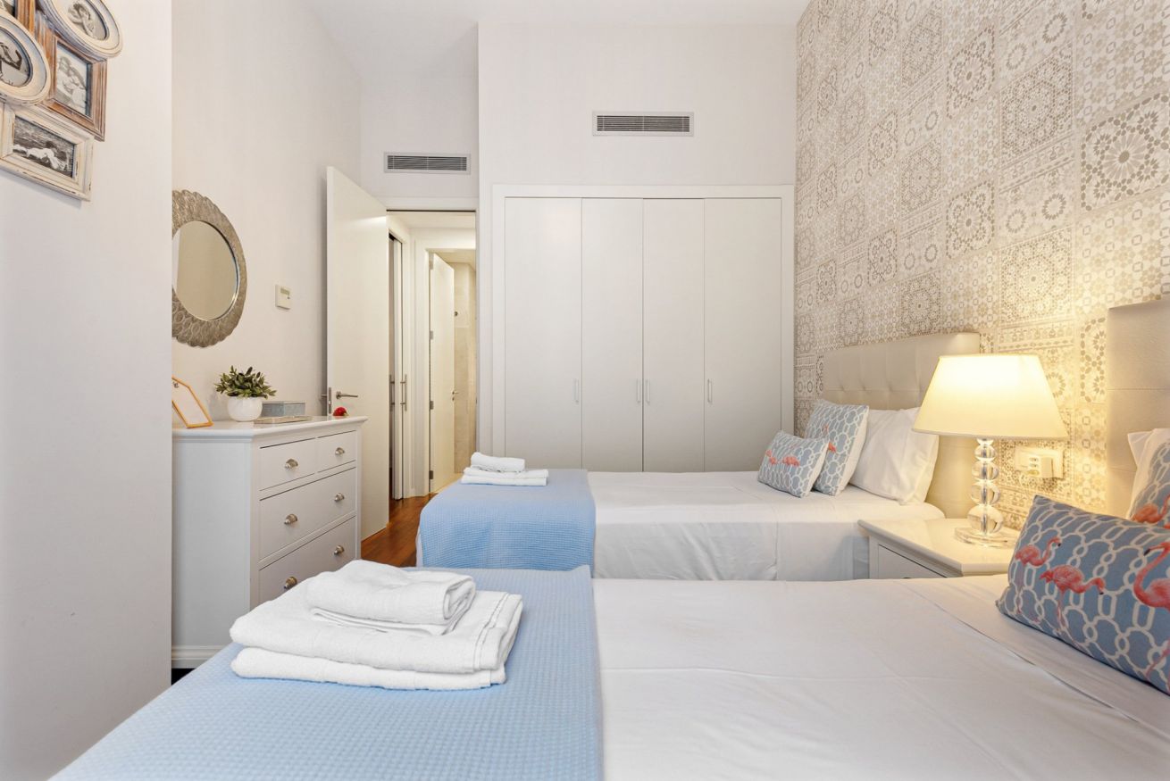 Este luminoso apartamento cuenta con dos habitaciones cómodas y bien equipadas: una con cama doble y otra con dos camas individuales, proporcionando flexibilidad y confort para todos los huéspedes.