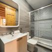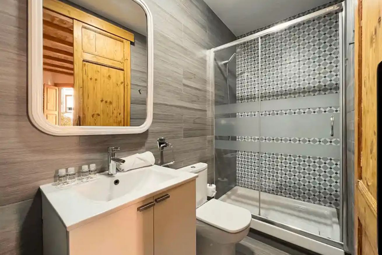 El baño con diseño moderno, cuenta con inodoro, ducha, lavamanos y todos los artículos esenciales para tu comodidad, como toallas y jabón de mano.