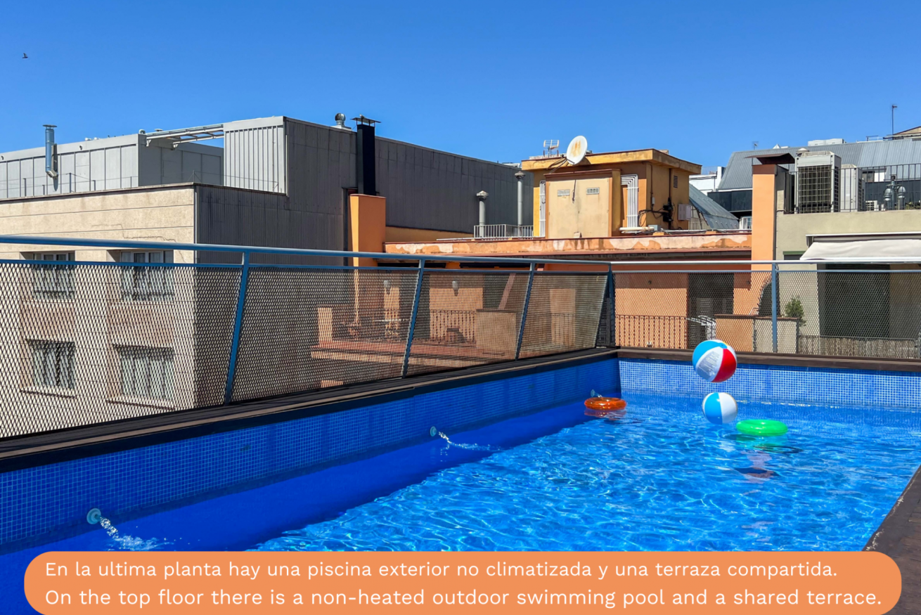El edificio dispone de piscina y terraza compartidas, por lo que cuando se aloje en este apartamento tendrá derecho a utilizar estas zonas. Las zonas comunes y la piscina están abiertas de lunes a domingo de 9:00h a 21:00h.